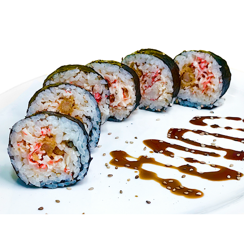 Rollo coreano de arroz envuelto en alga, relleno con camarón katchu trozos de camarón apanados y fritos y palmitos de cangrejo. una combinación de texturas crujientes y suaves, que aporta un sabor especial inspirado en la comida callejera coreana.
