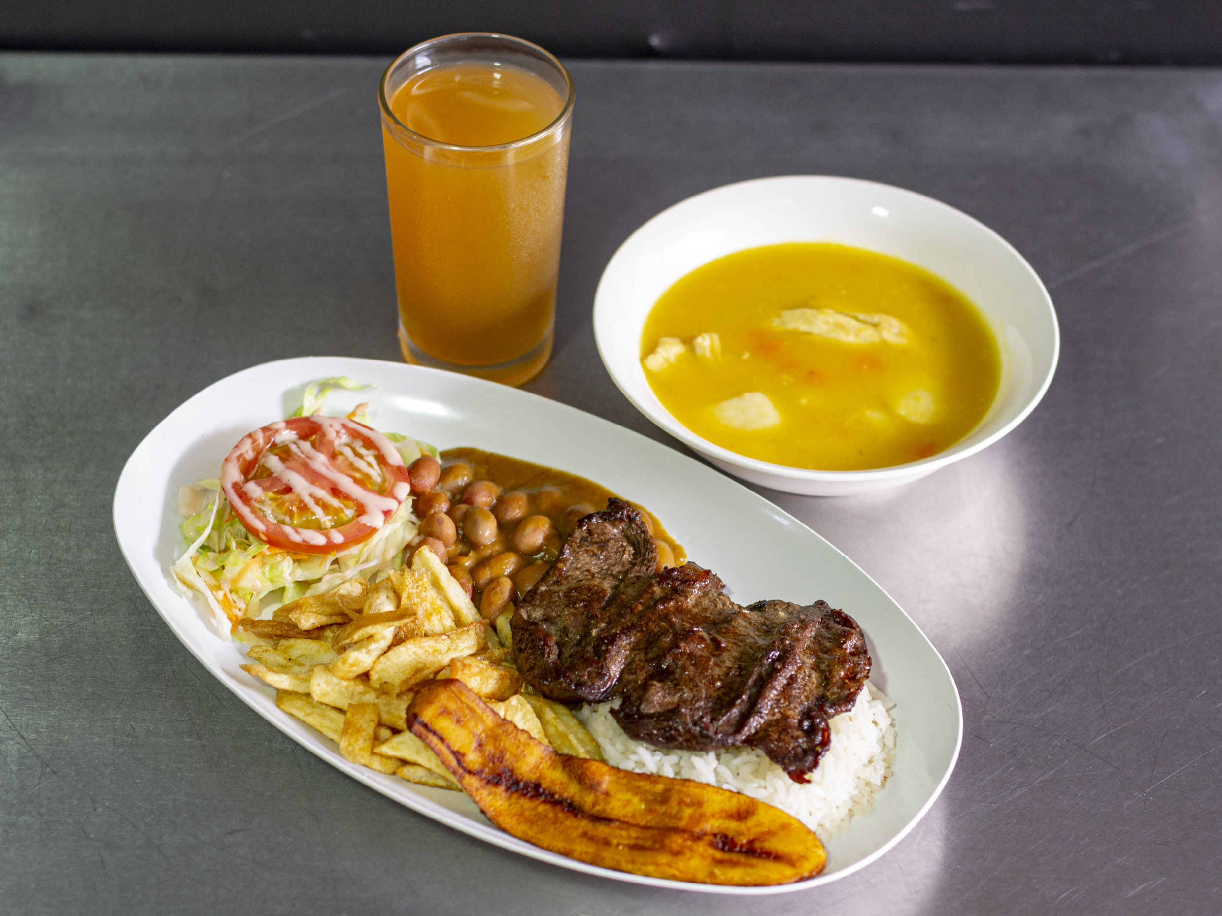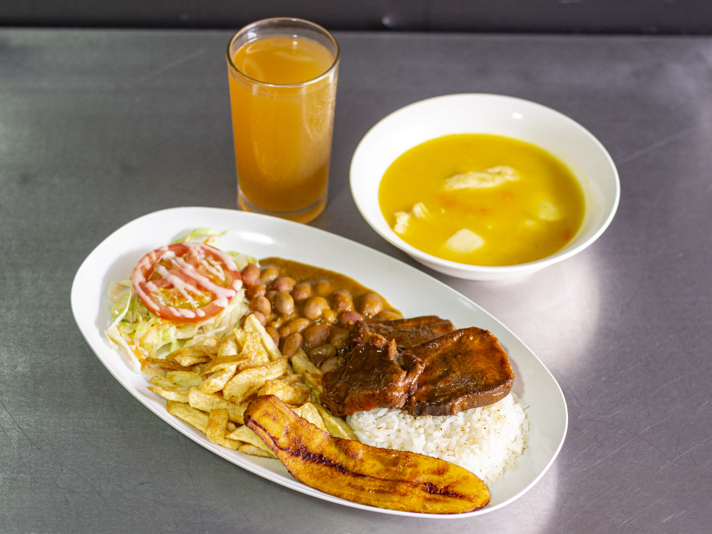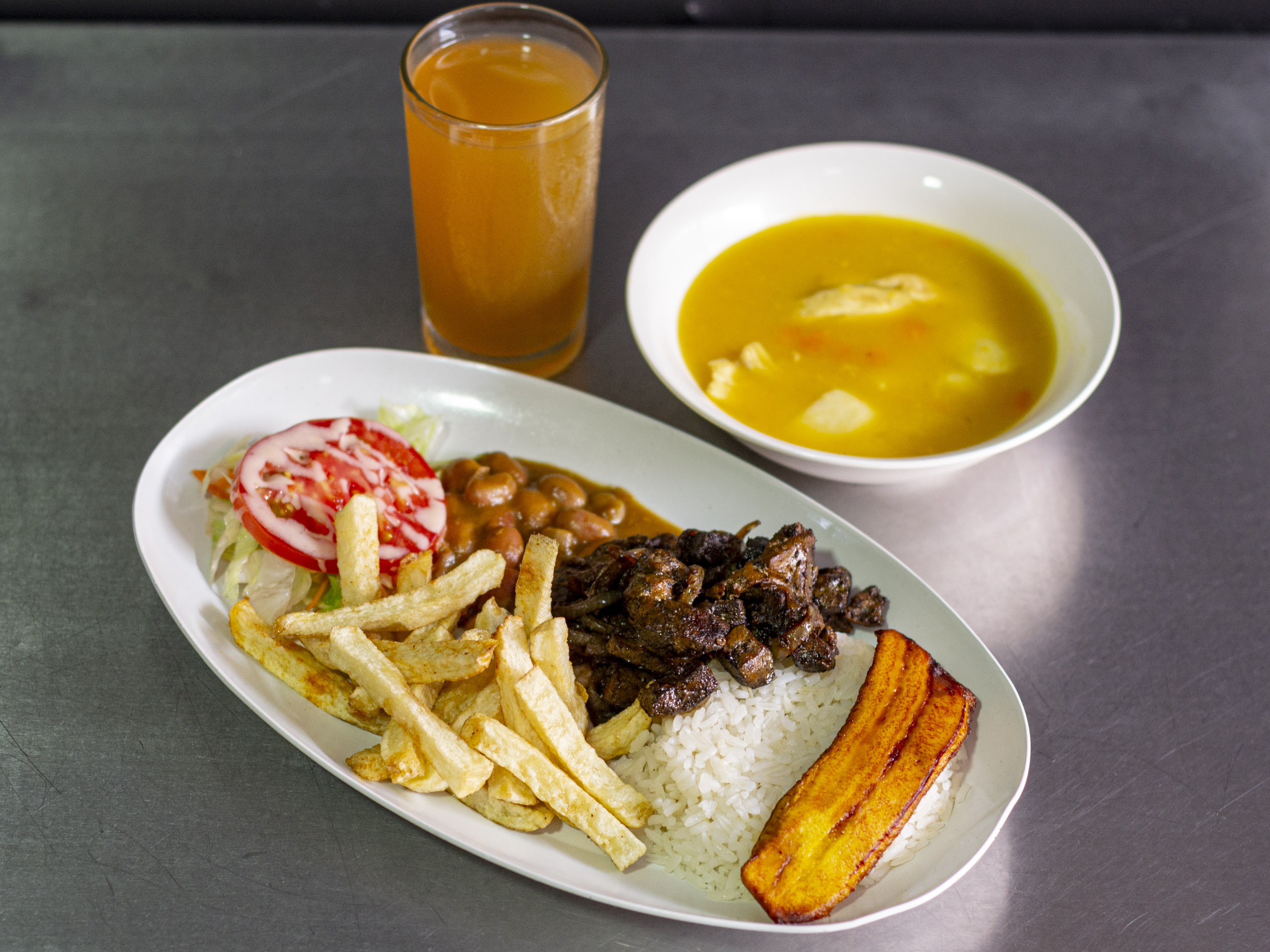 Bandeja de carne de res con arroz blanco, tajada de maduro, ensalada de la casa, papas a la francesa, frijoles, acompañada con sopas del dia y jugo del dia