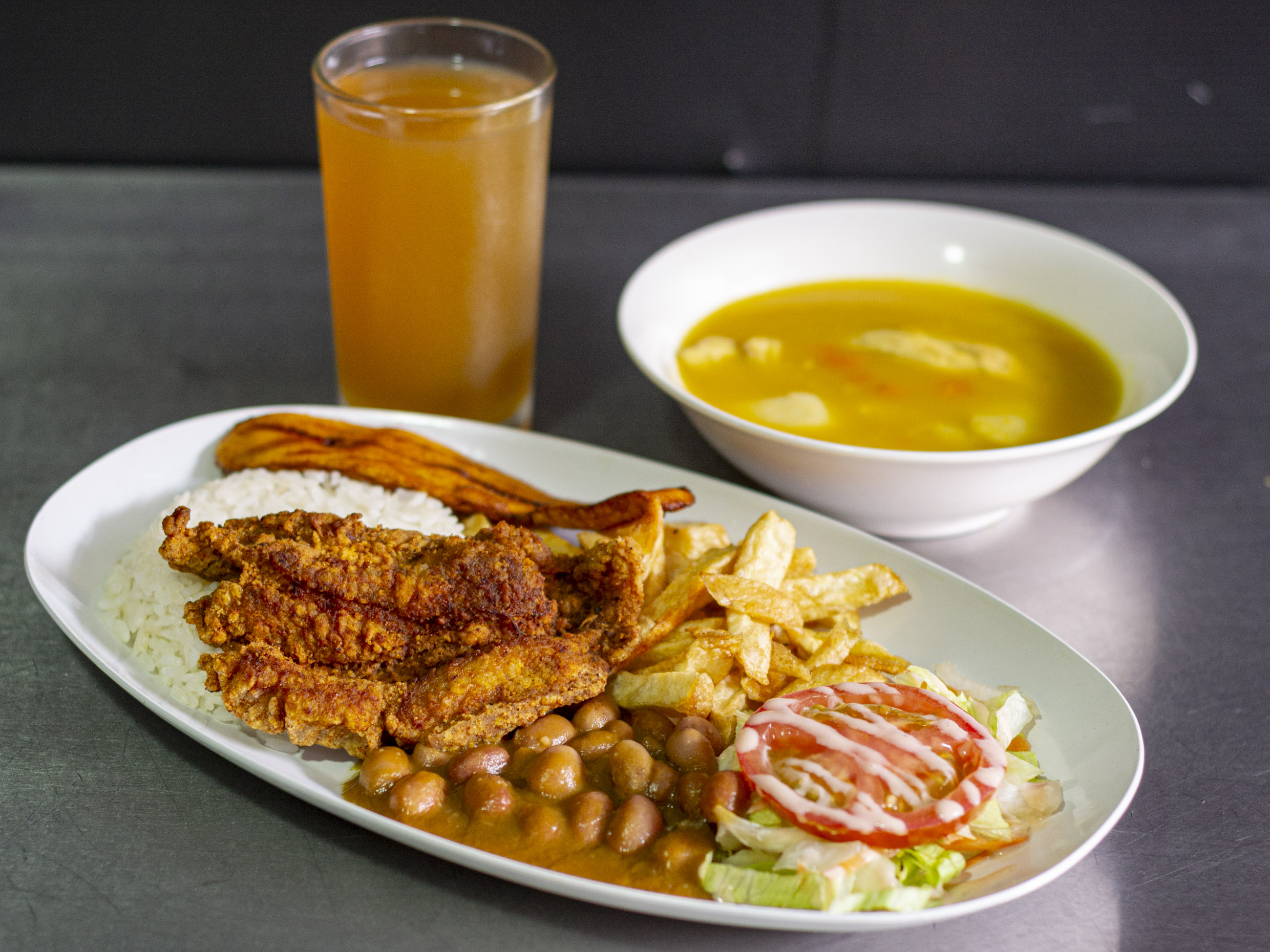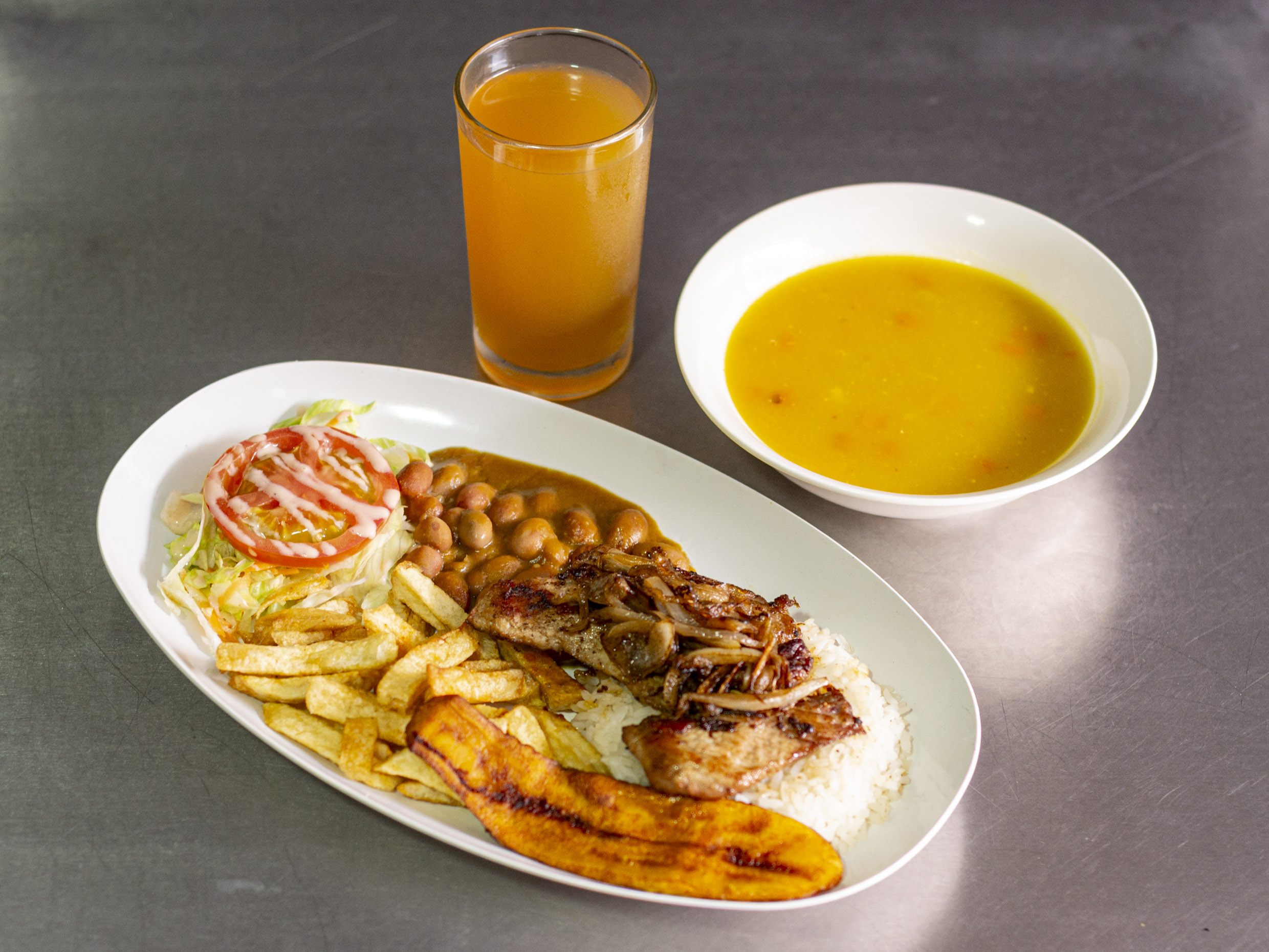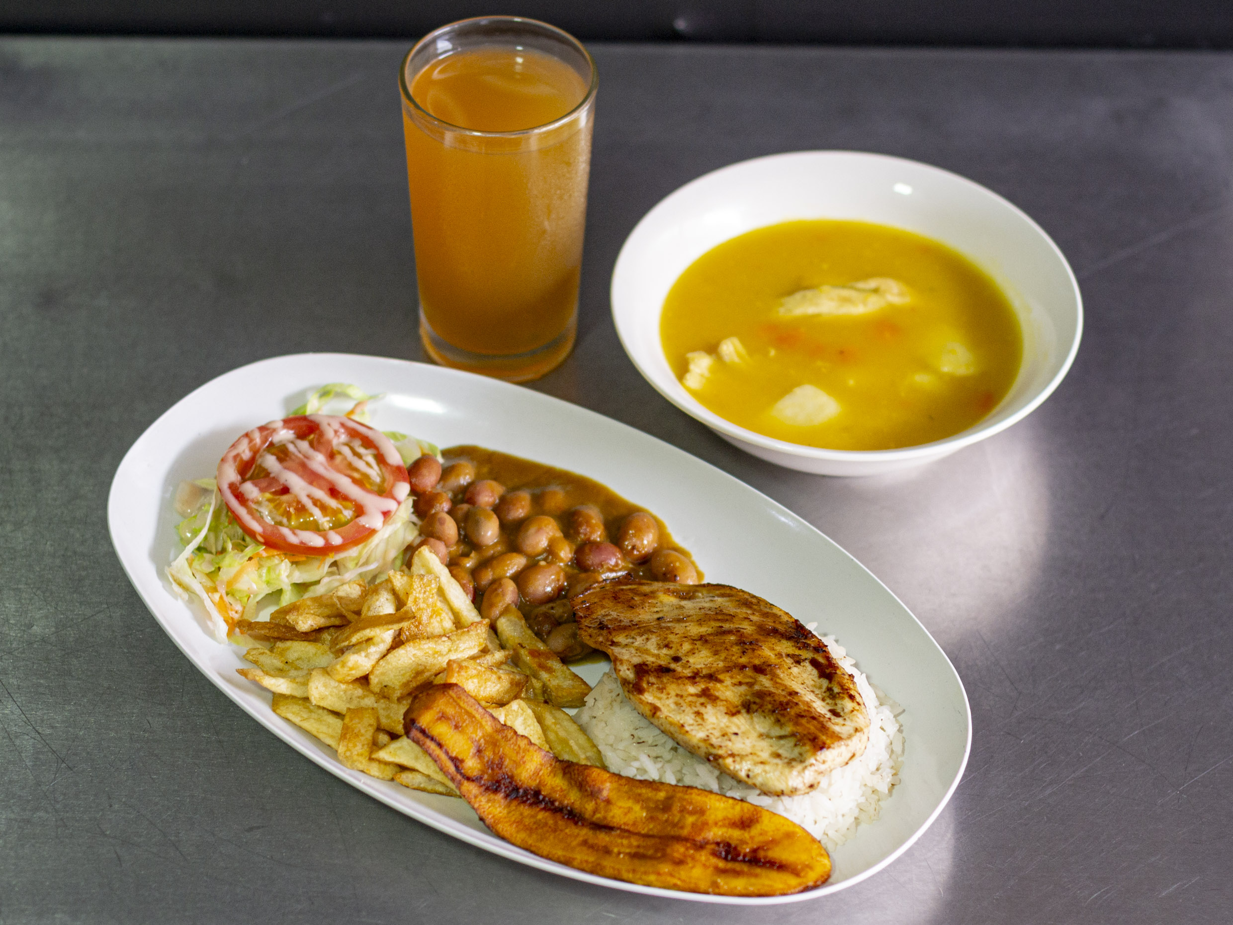 Bandeja de pechuga de pollo a la plancha con arroz blanco, tajada de maduro, ensalada de la casa, papas a la francesa, frijoles, acompañada con sopas del dia y jugo del dia