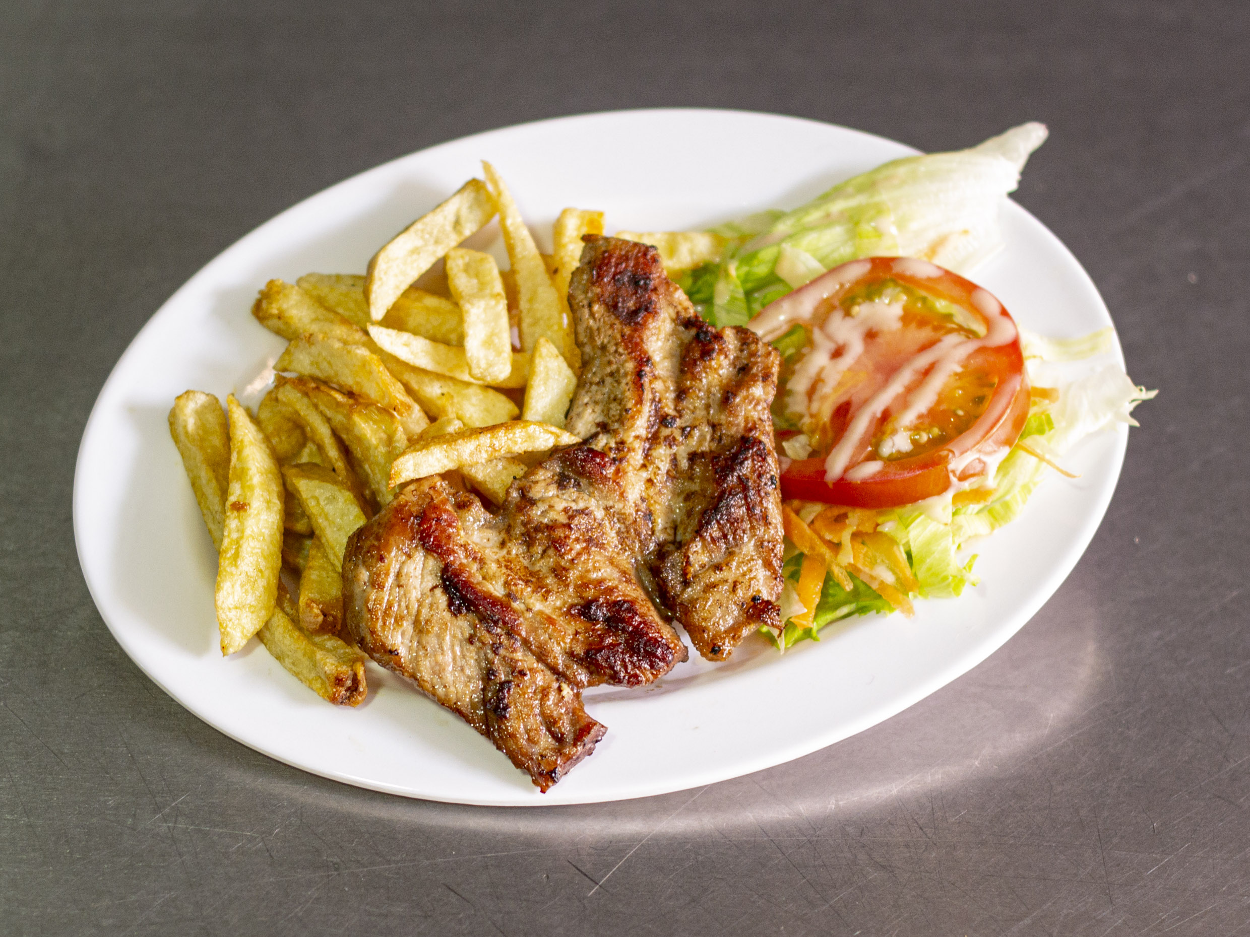 250gr De carne de cerdo, arepa con queso mozarella, papas a la francesa, ensalada de la casa o ensalada de lechuga, tomate y zanahoria.