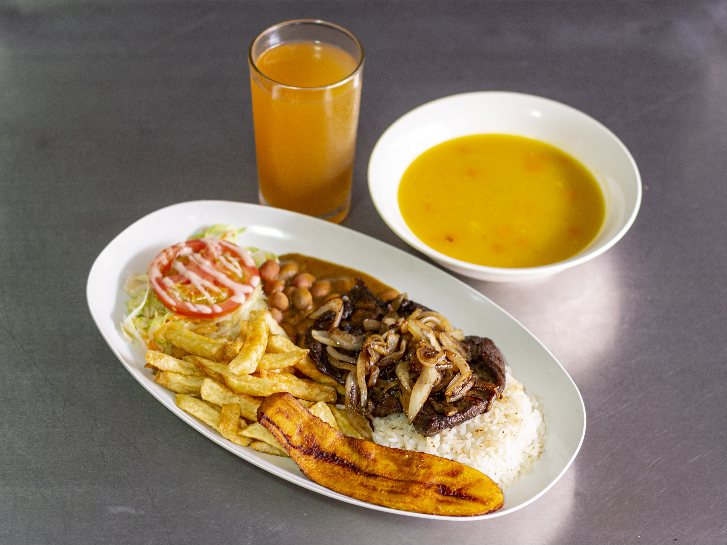 Bandeja de res encebollada , con arroz blanco, tajada de maduro, ensalada de la casa, papas a la francesa, frijoles, acompañada con sopas del dia y jugo del dia