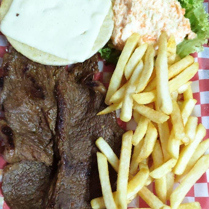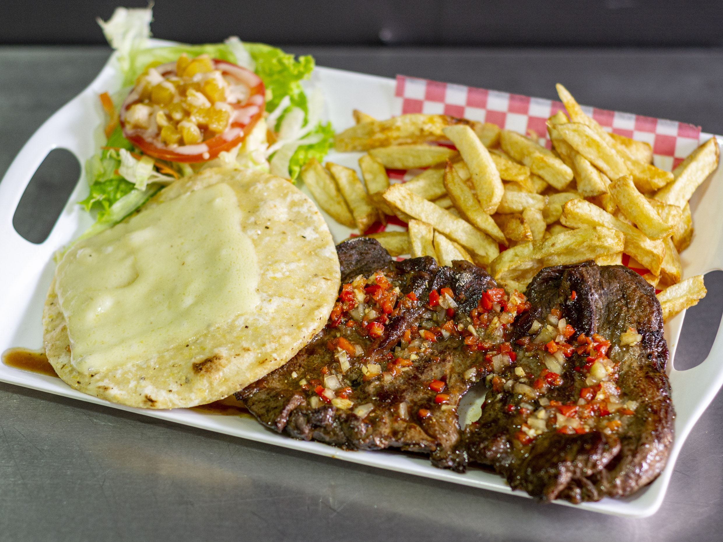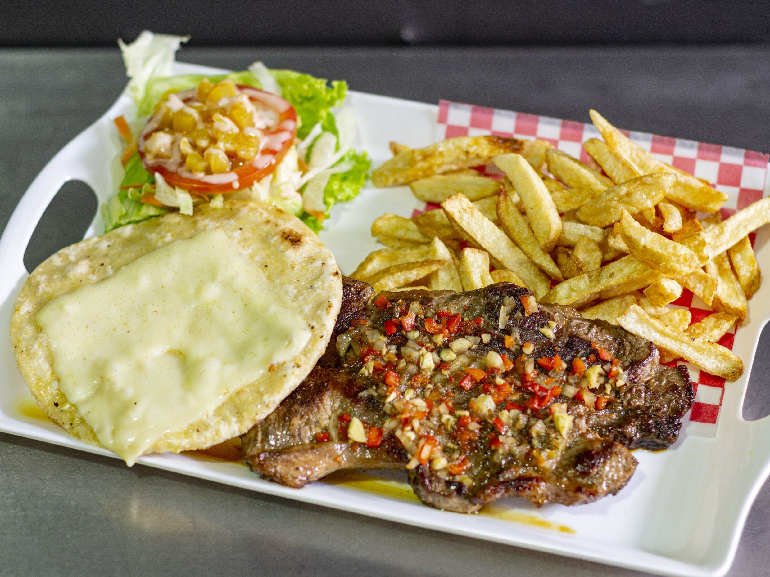 250 g De carne punta de anca, arepa con queso mozarella, papas a la francesa, ensalada de la casa o ensalada de lechuga, tomate y zanahoria.