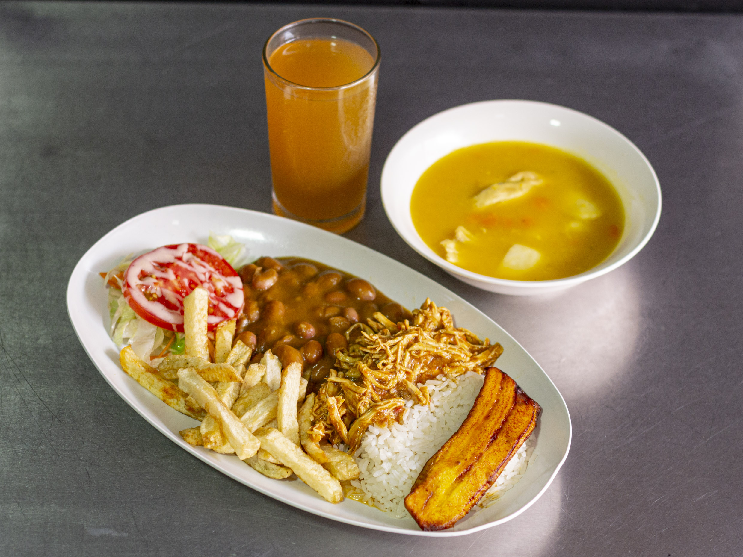 Bandeja de carne desmechada , con arroz blanco, tajada de maduro, ensalada de la casa, papas a la francesa, frijoles, acompañada con sopas del dia y jugo del dia