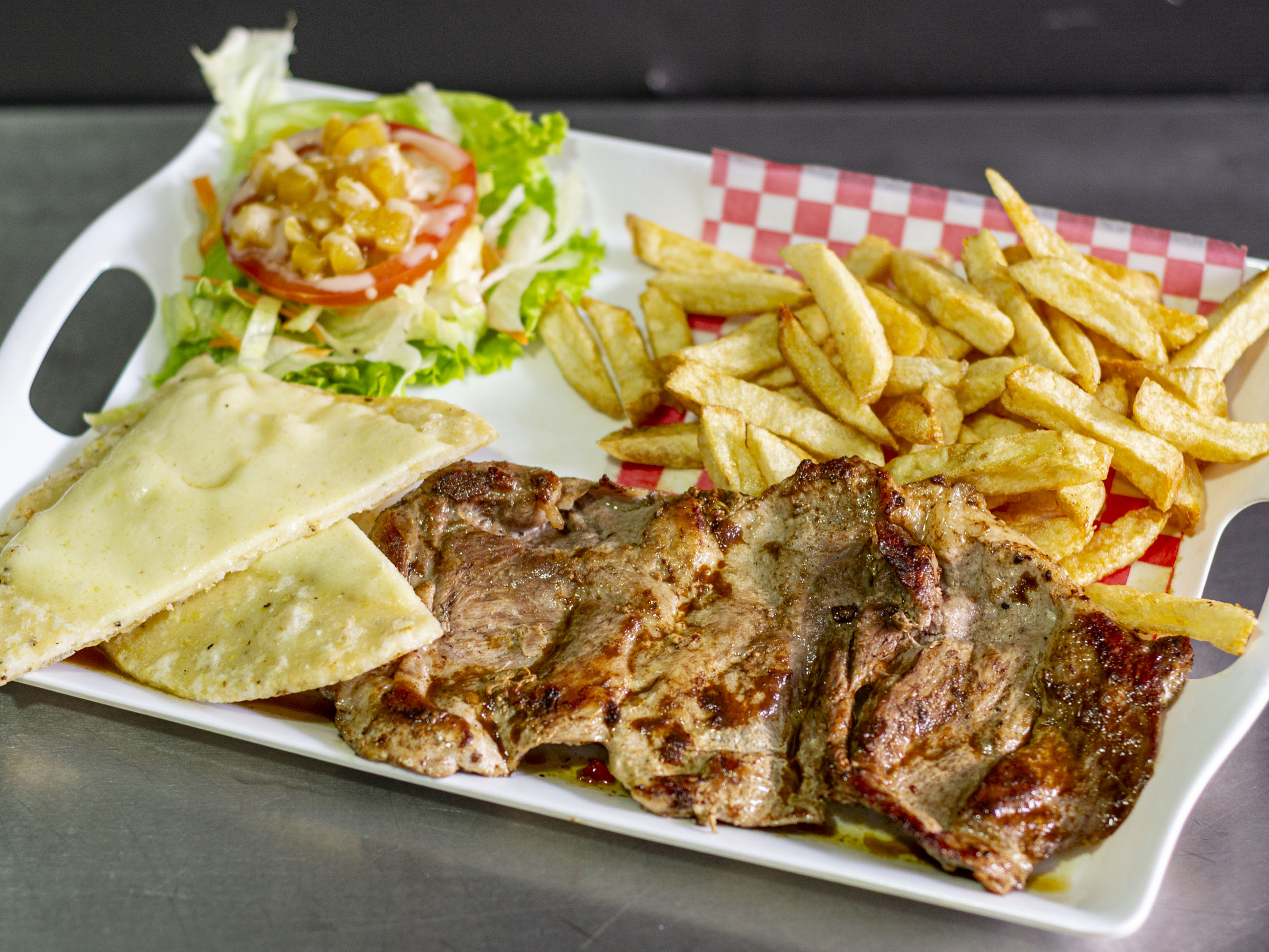 250 g De churrasco, arepa con queso mozarella, papas a la francesa, ensalada de la casa o ensalada de lechuga, tomate y zanahoria.