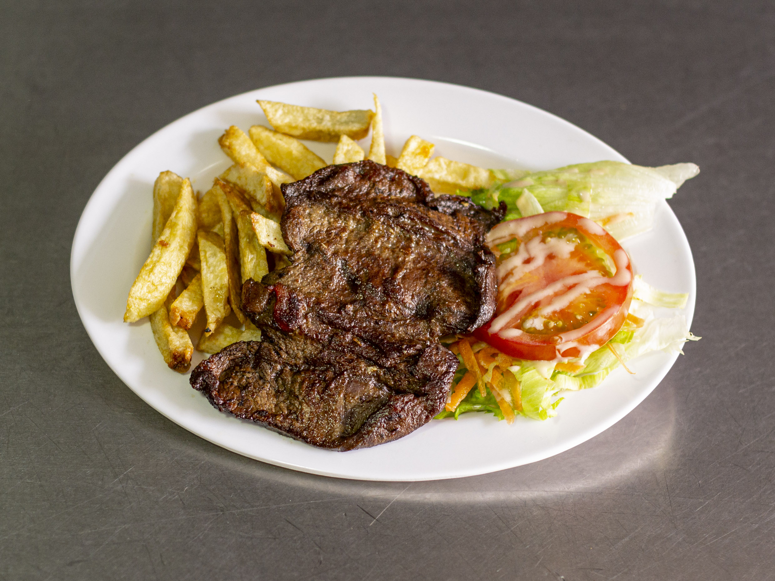 250 g De solomo redondo, acompañado de papas a la francesa, arepa con queso, ensalada de la casa o ensalada de lechuga, tomate y zanahoria.