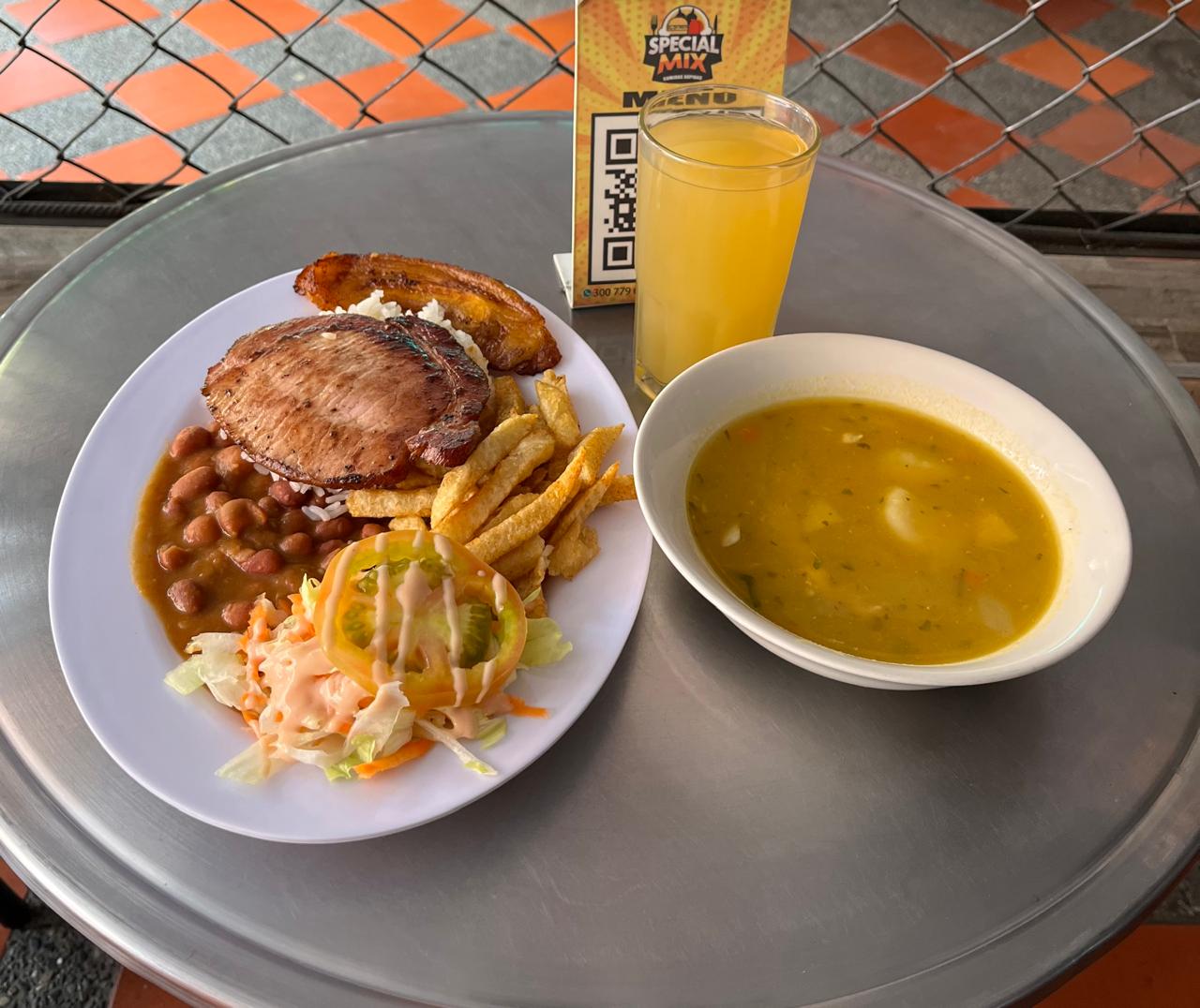 Bandeja de cerdo con arroz blanco, tajada de maduro, ensalada de la casa, papas a la francesa, frijoles, acompañada con sopas del dia y jugo del dia