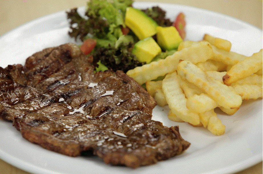 250 Gramos de carne solomito redondo arepa con queso mozzarella, papas a la francesa, ensaladas opcionales, lechuga tomate, zanahoria, a base de cream de leche.