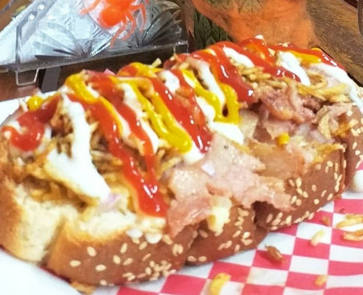 Pan de perro bimbo, tocineta, carne de res artesanal en trozos, pechuga de pollo en trozos, queso mozzarella, ripio de papa, ensalada de repollo, salsas artesanales de la casa.