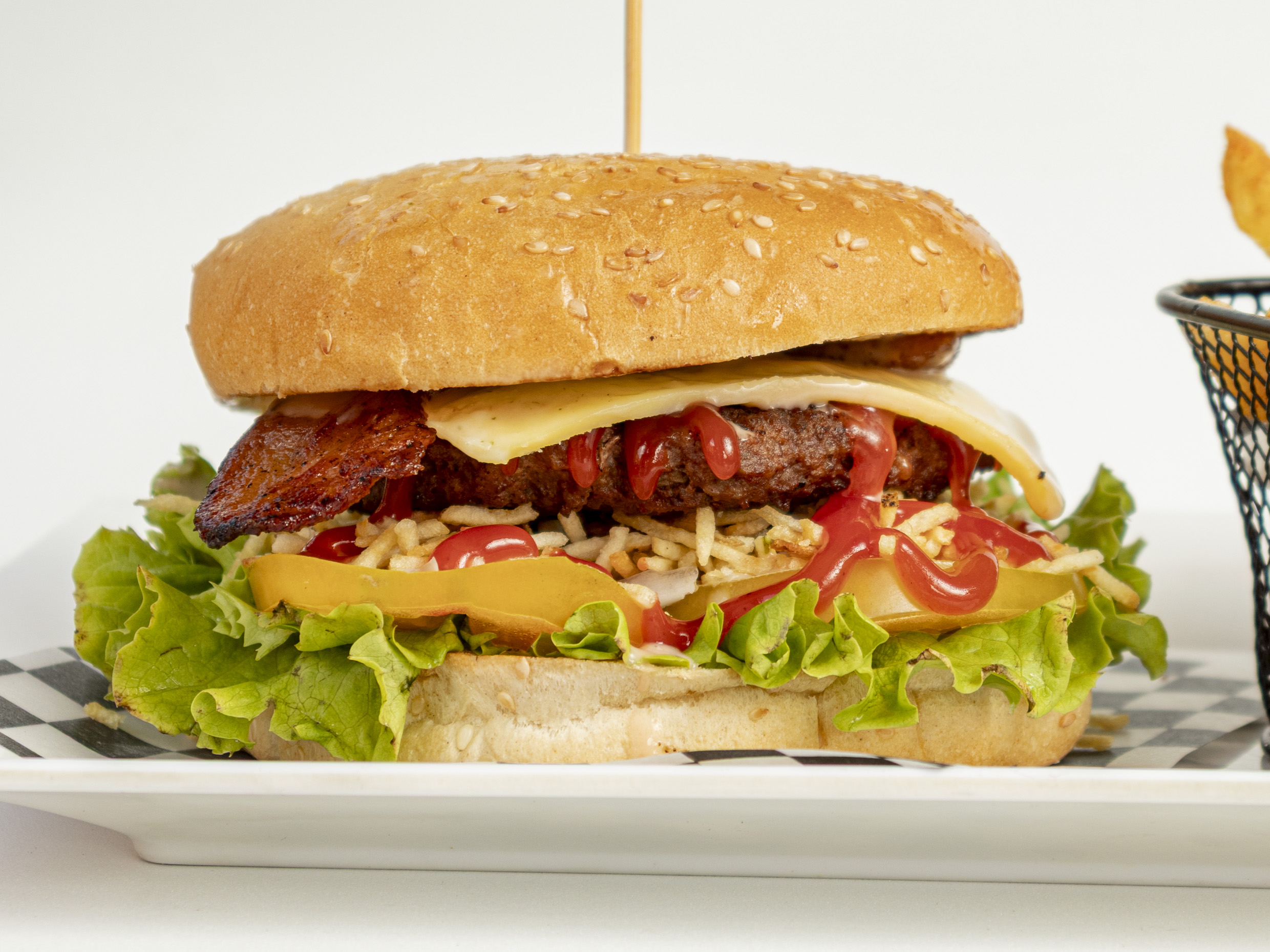 Pan artesanal con mezcla de ajonjoli carne de res artesanal queso mozzarella gratinado, tocineta, ripio de papa, tomate, lechuga fresca cebolla, salsas de la casa., acompañada de papas a la francesas