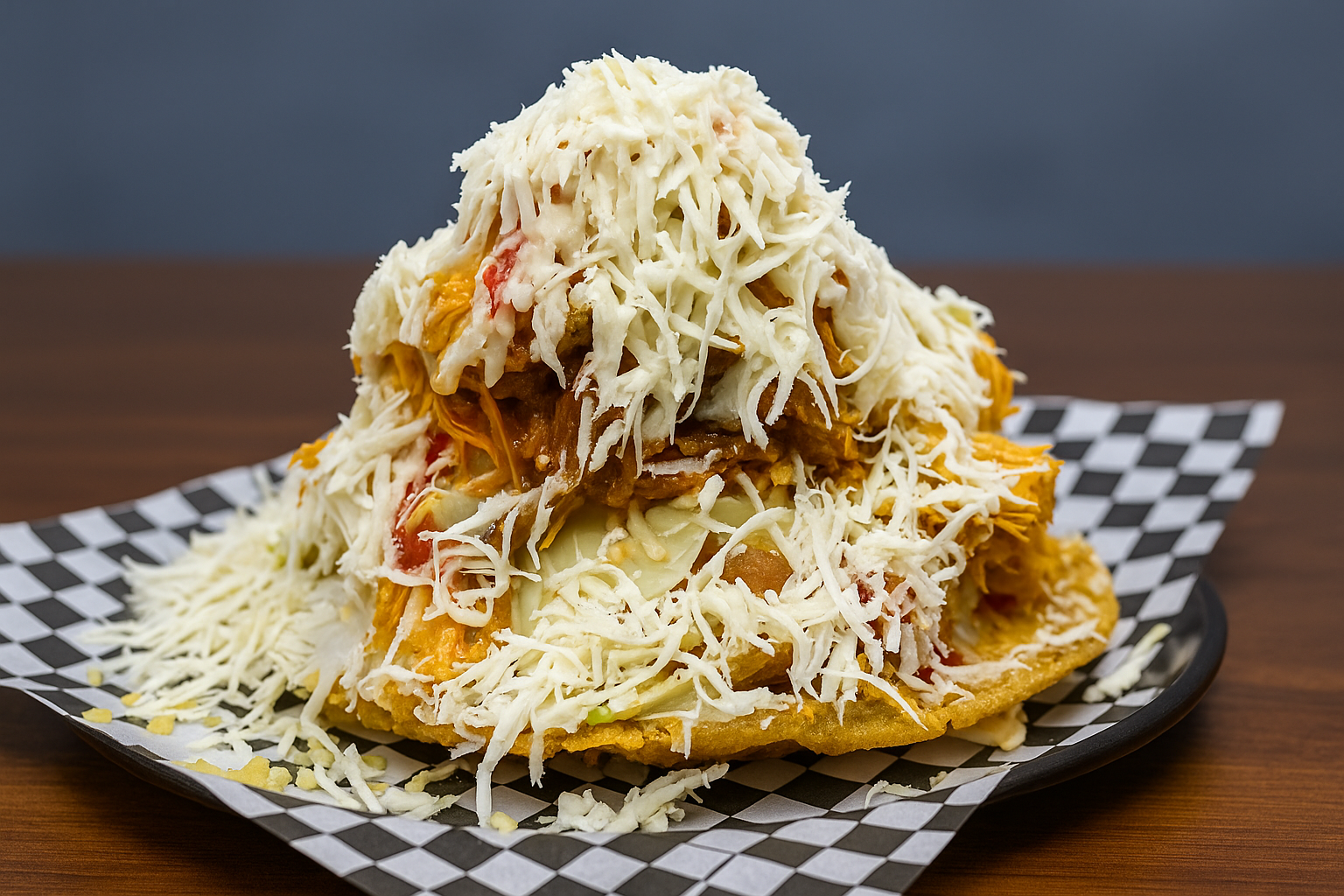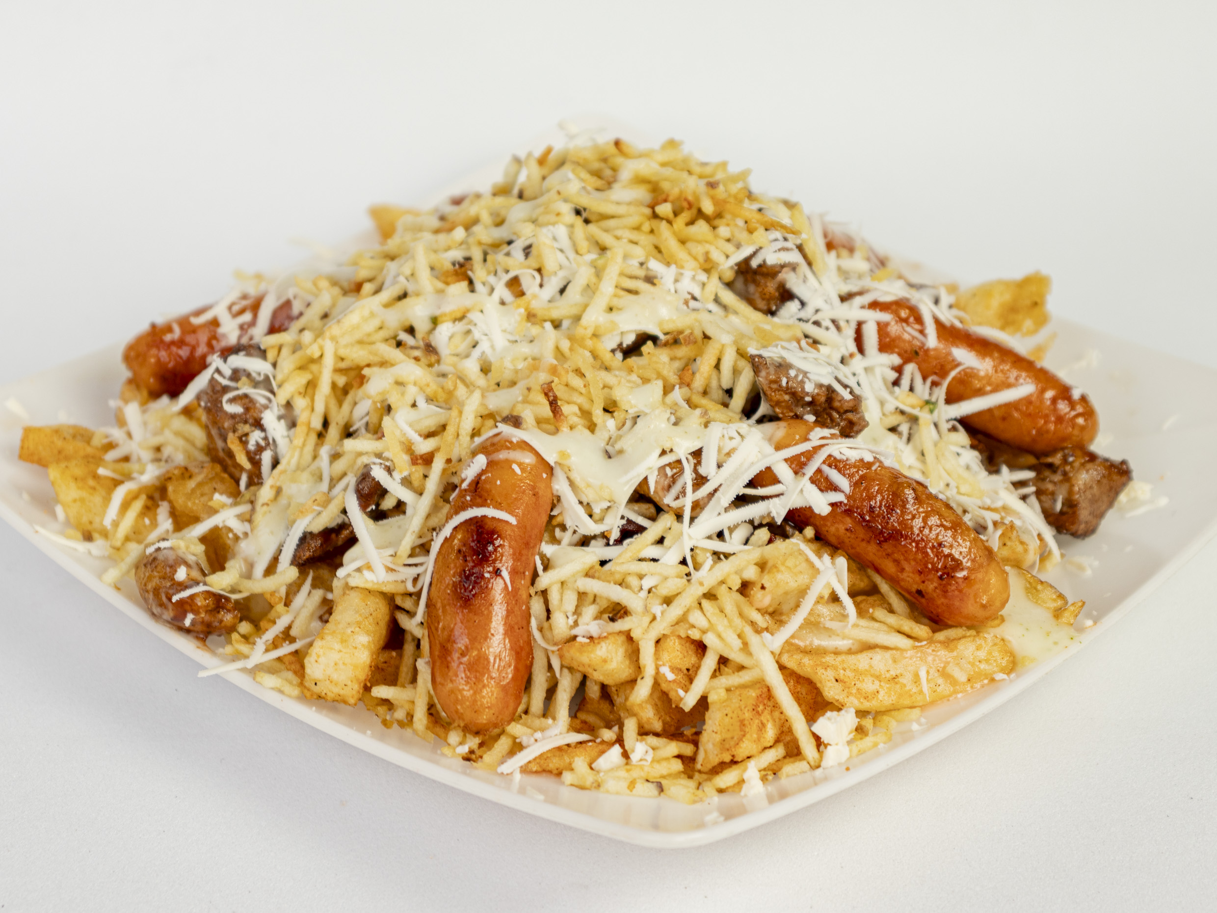 350 gramos de papas a la francesa, doble porción de carne de res artesanal, doble porción de chorizo de cerdo artesanal, doble porción de pechuga de pollo, carne de cerdo en trozos, doble tocienta, queso mozzarella gratinado, lechuga fresca, doble porción de arepa, salsas de la casa.