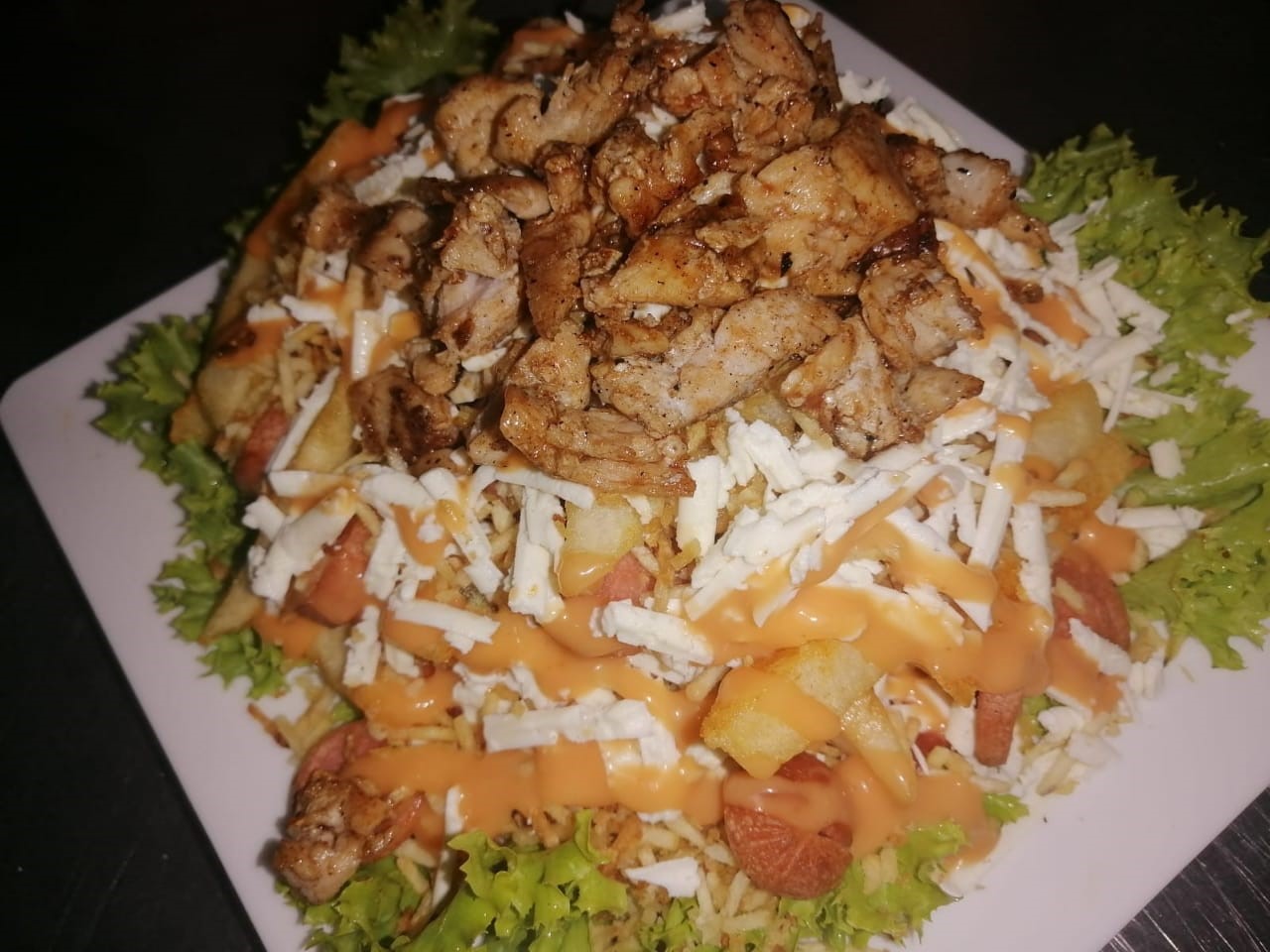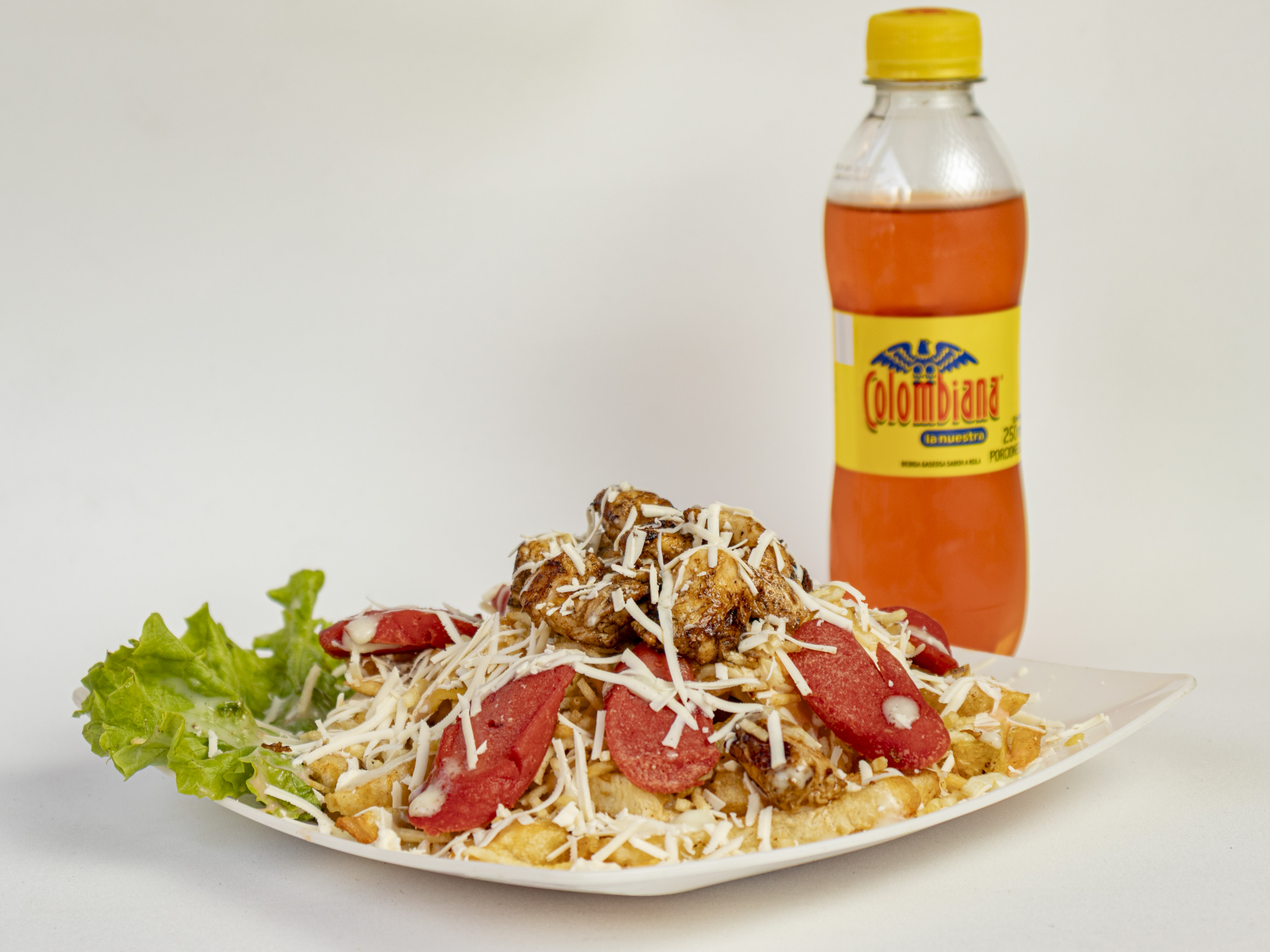 250 gramos de papas a la francesa, pechuga de pollo en trozos salteados en salsa BBQ, salchicha zenu, lechuga fresca, ripio de papa, queso costeño rallado, salsas de la casa. para una persona