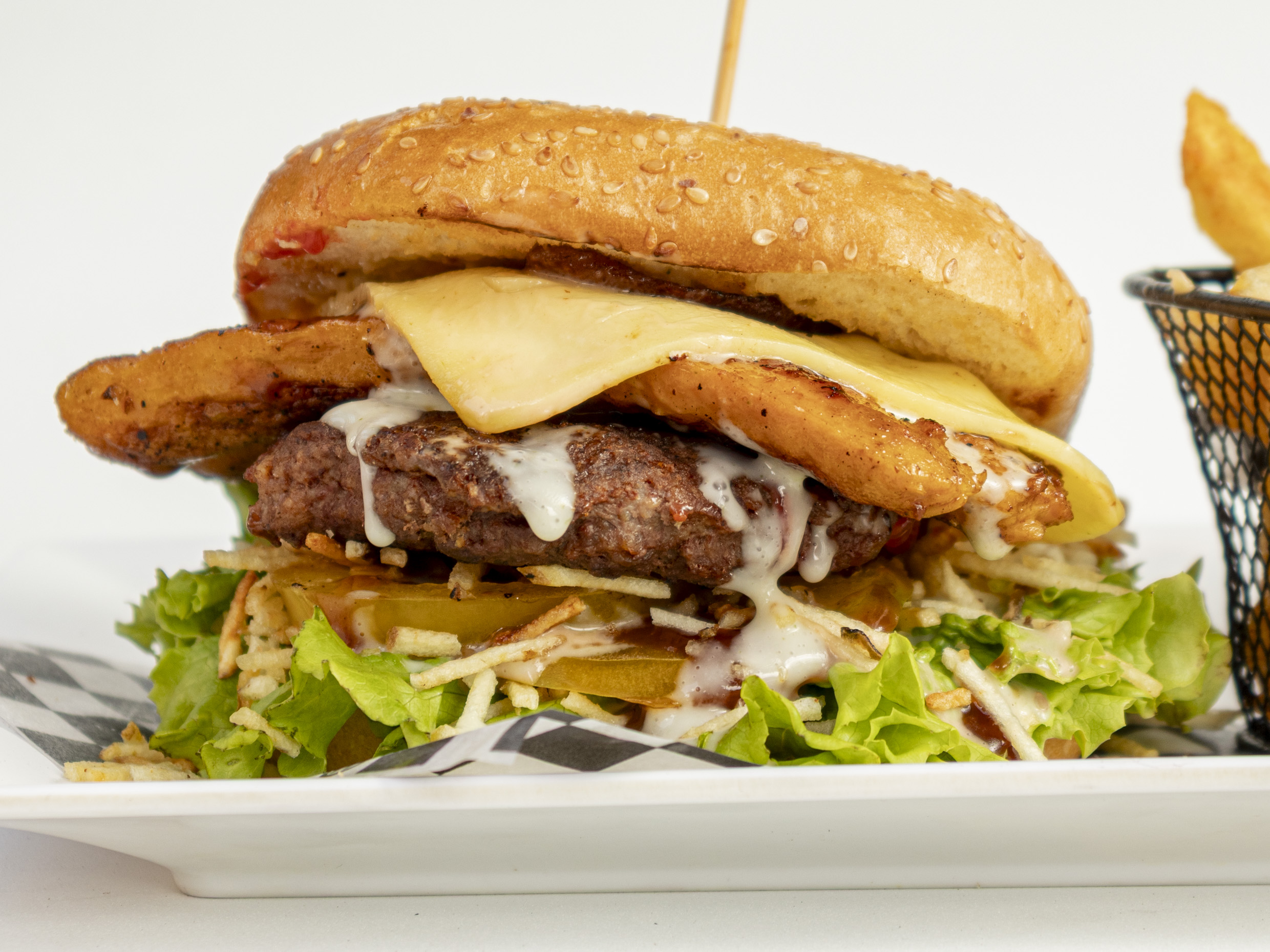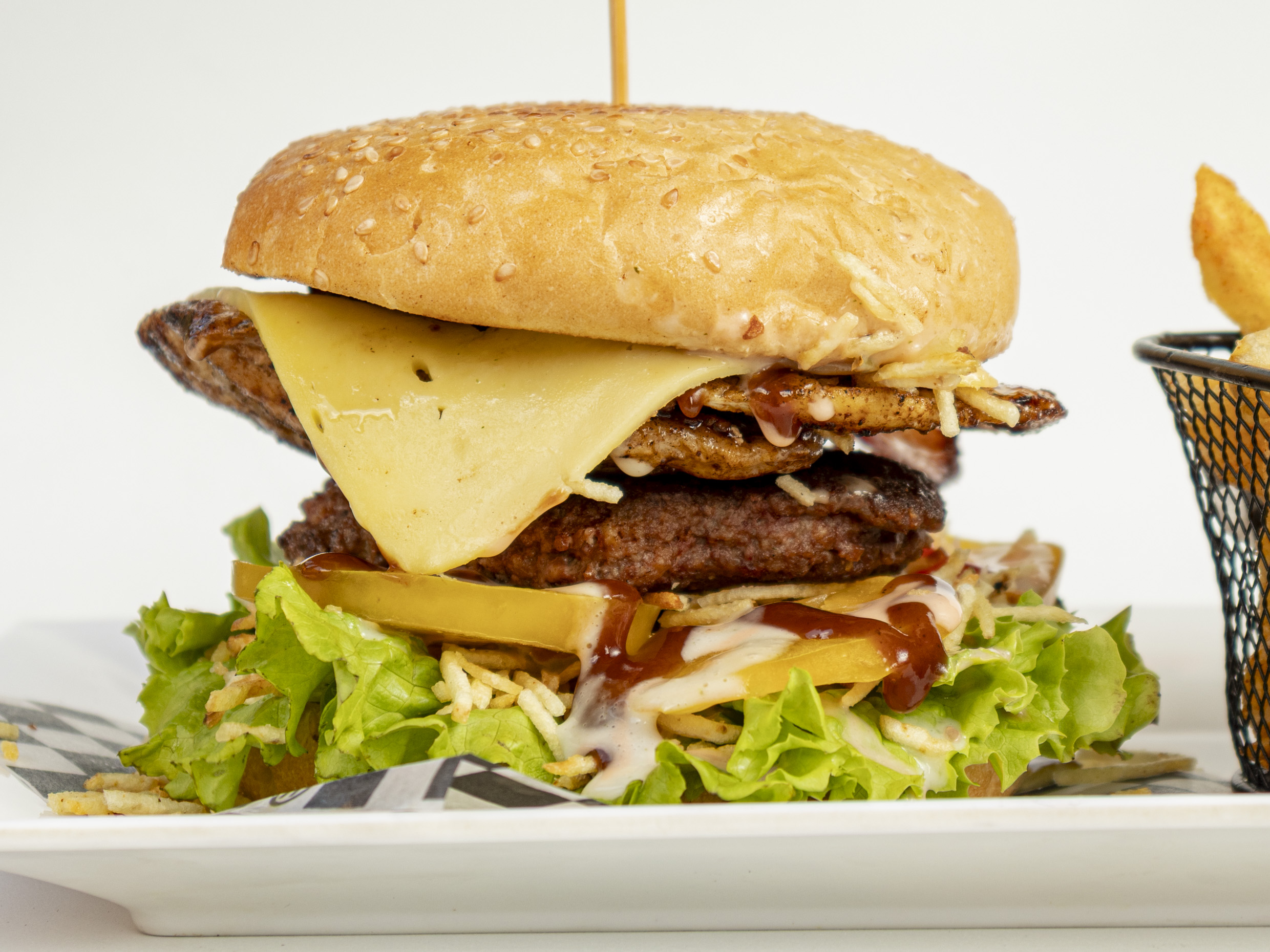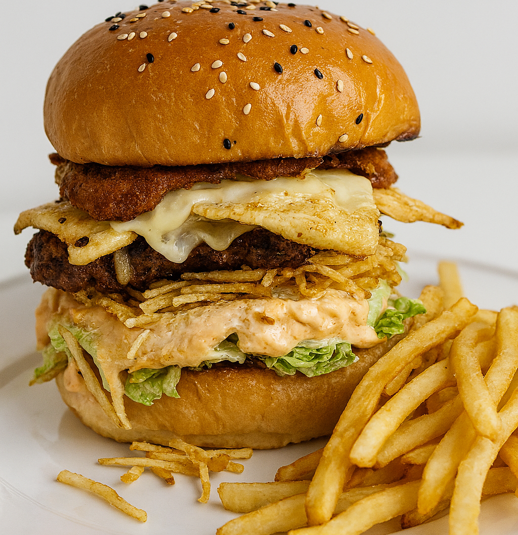 Pan artesanal con ajonjoli, carne de res artesanal, carne de cerdo a la plancha y pollo a la plancha, tocineta, doble queso mozarella gratinado, ripio papa, lechuga, tomate y cebolla, acompañada de papas a la francesas