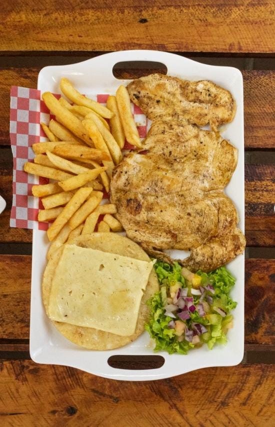 250 Gramos de pechuga de pollo arepa con queso mozzarella, papas a la francesa, ensaladas opcionales, lechuga tomate, zanahoria, a base de cream de leche.