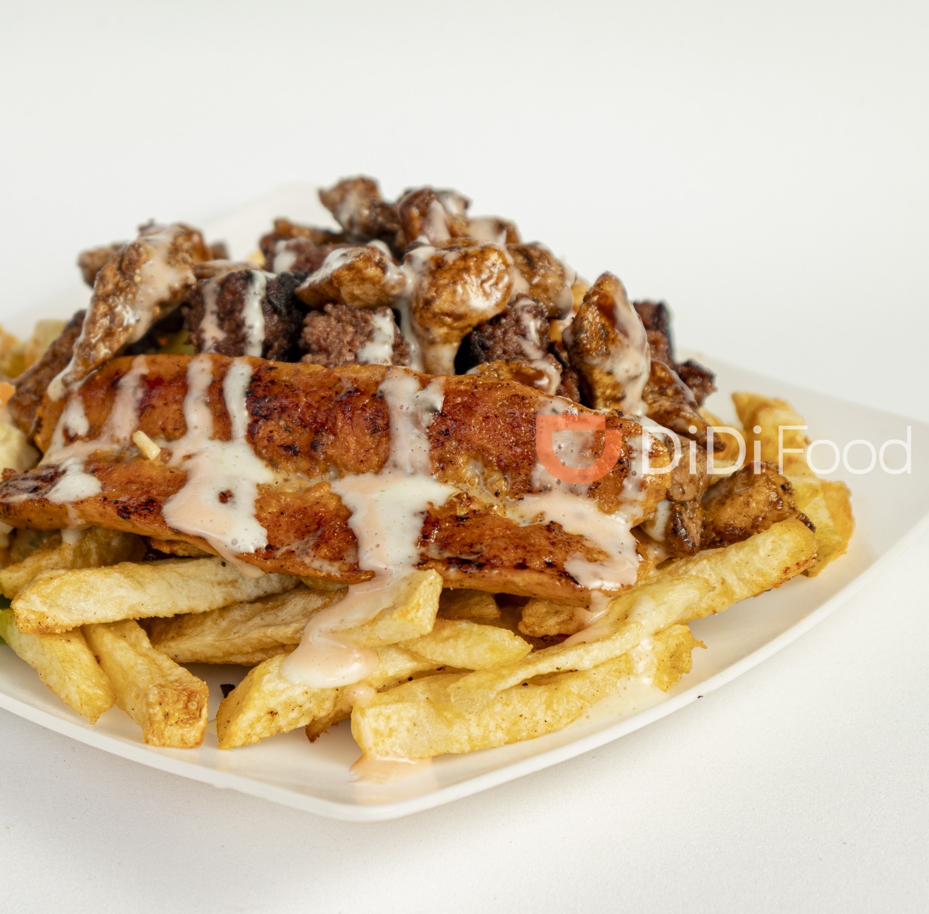 200 gramos de papas a la francesa, carne de cerdo en trozos, pechuga de pollo en trozos, chorizo de cerdo artesanal, queso mozzarella gratinado, lechuga fresca, salsas de la casa, perfecta para 1 persona
