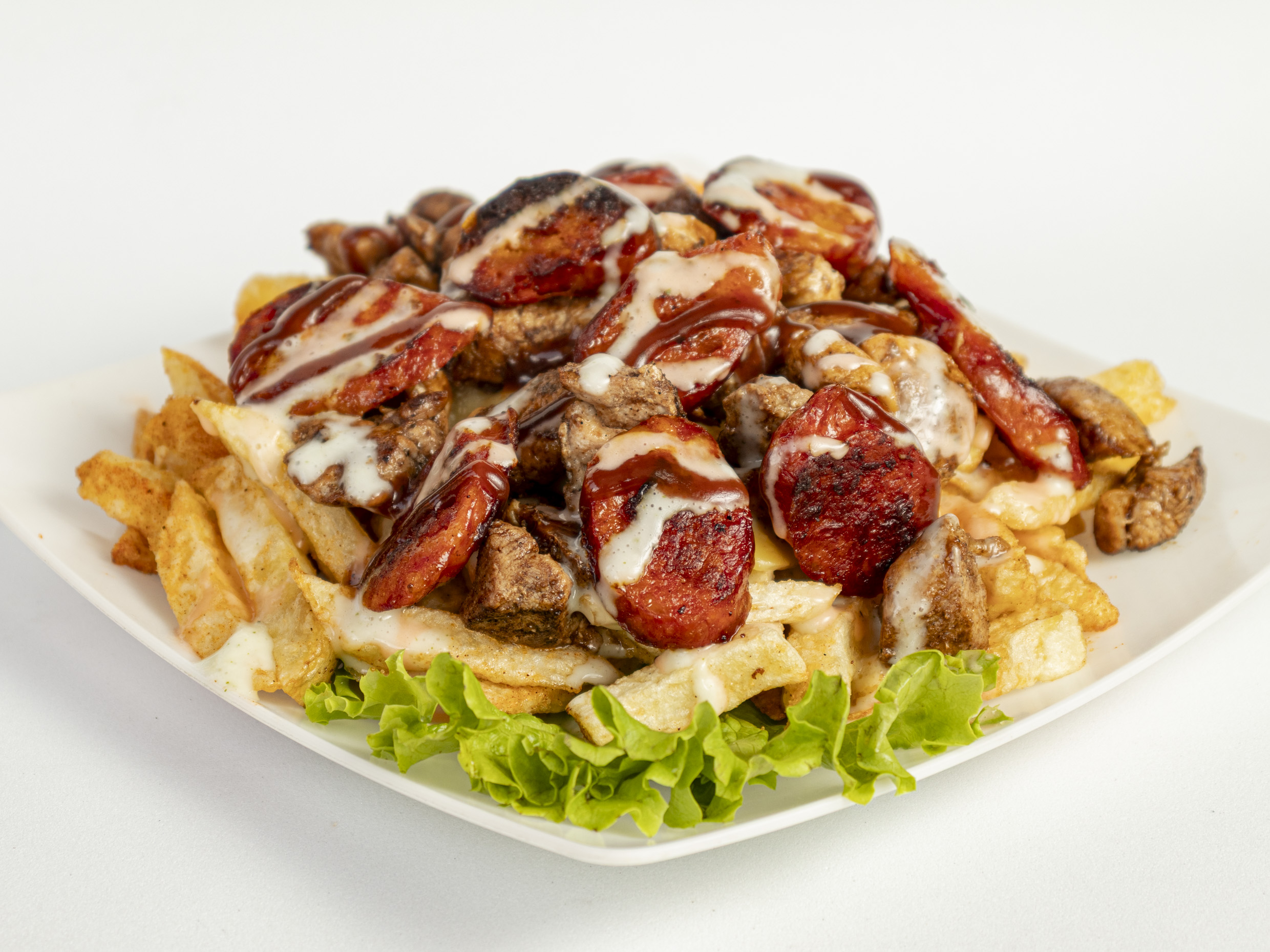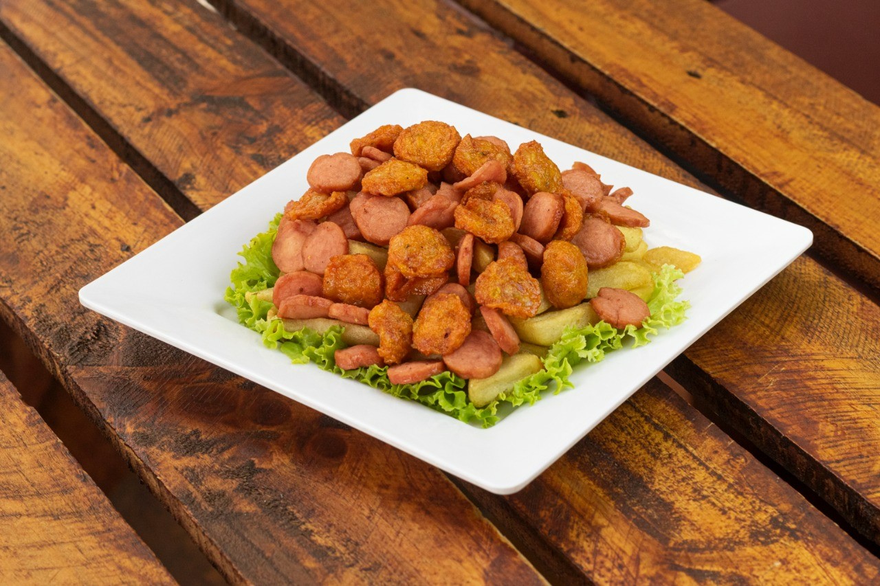 350 grs de papas a la francesa, pechuga de pollo y cerdo en trozos salteada en salsa bbq, ripio de papas, chorizo coctelero, Tocineta, salchicha zenu, queso costeño y salsa de la casa