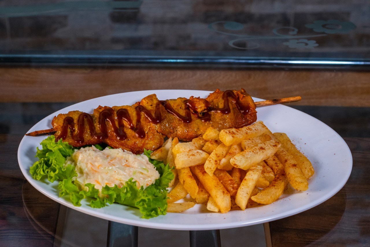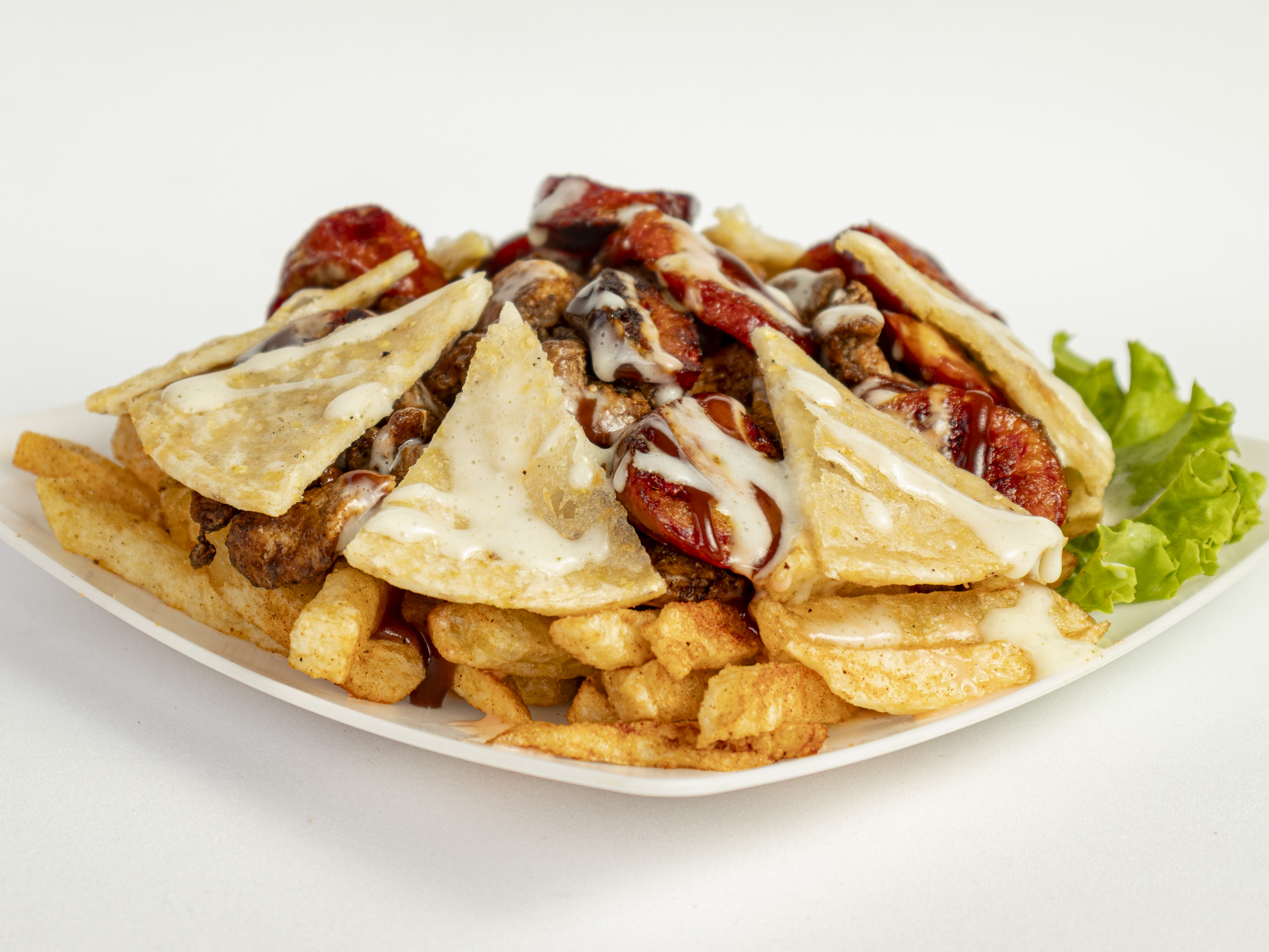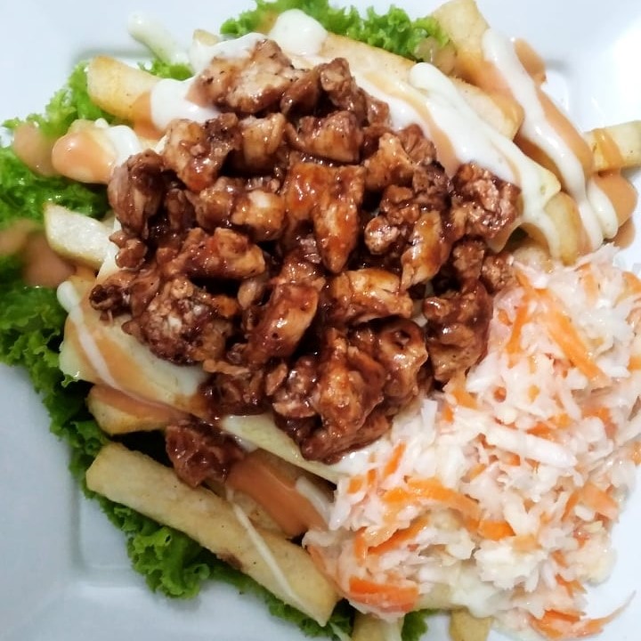 250 gramos de papas a la francesa, pechuga de pollo en trozos salteados en salsa BBQ, queso mozzarella gratinado, lechuga fresca, salsas de la casa, acompañado con ensalada de repollo a base crema de leche.