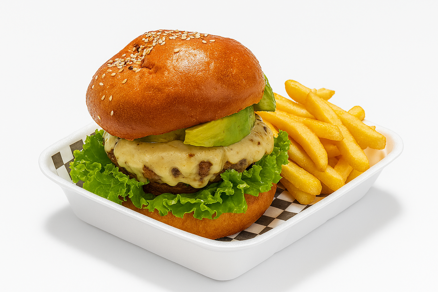 Pan artesanal con mezcla de ajonjoli, carne de res artesanal queso mozzarella gratinado huevo frito aguacate ripio de papa, tomate, lechuga fresca, cebolla, salsa de la casa, acompañada de papas a la francesas