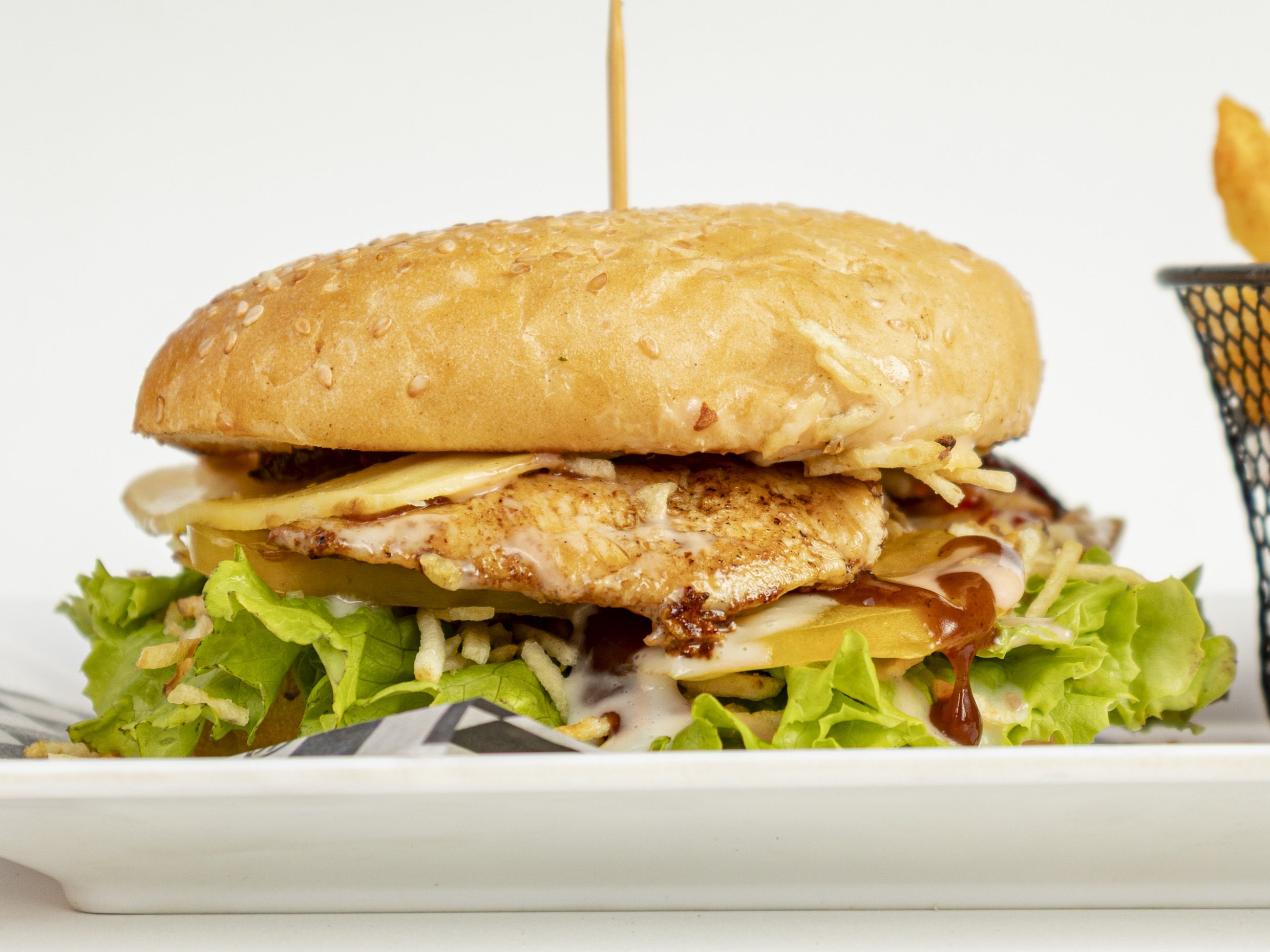 Pan artesanal con mezcla de ajonjoli, pechuga de pollo a la plancha, doble queso mozzarella gratinado, tocineta, ripio de papa, lechuga fresca, tomate, cebolla, salsa de la casa, acompañada de papas a la francesas