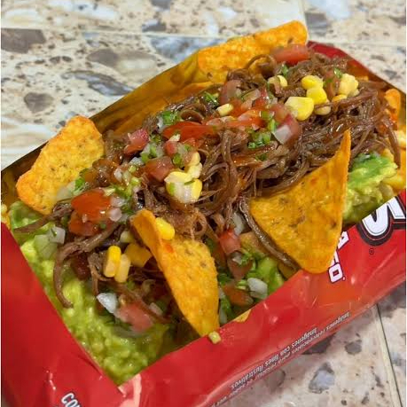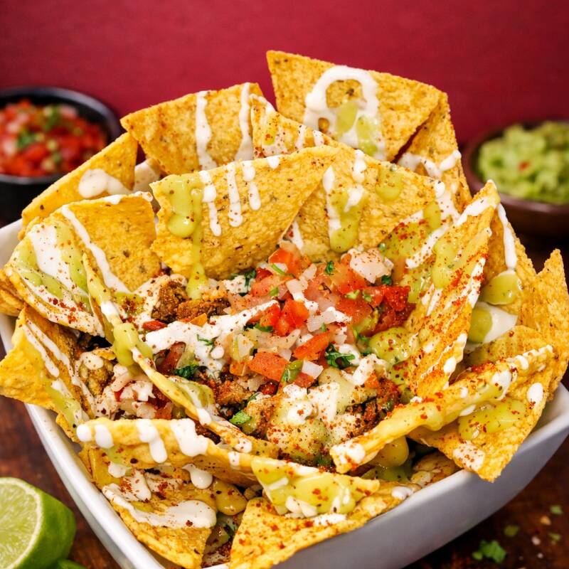 Doritos bañado en queso mozzarella gratinado, acompañado con la proteína de tu preferencia (Pollo, Carne desmechada o Cerdo). Incluye guacamole, sour cream, pico de gallo y pizza de Tajín.