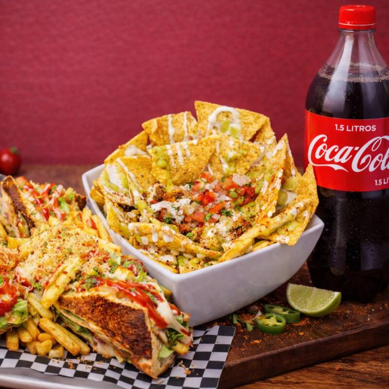 Club House, Nachos y una bebida 1.5. Aproximado: 3-4 personas.