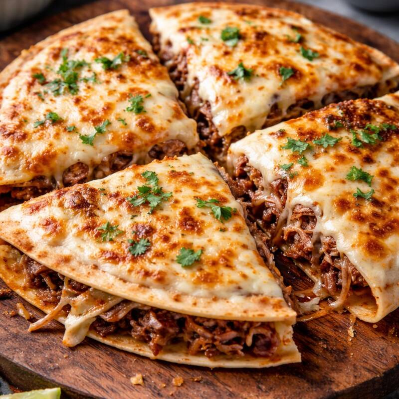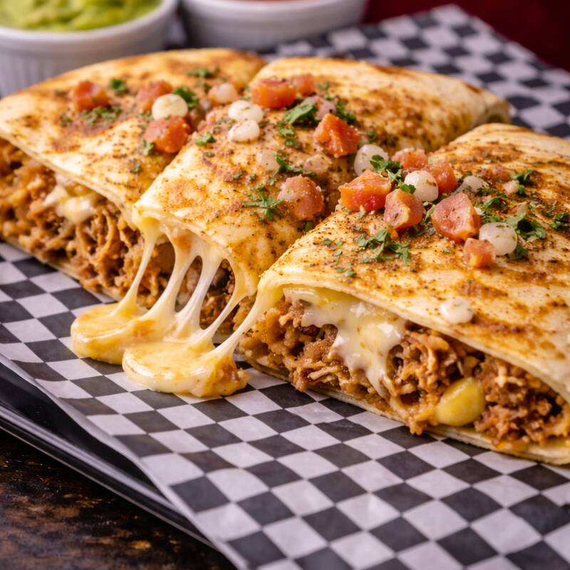 Tortilla doble rellena de queso mozarella, maíz y proteína (pollo, carne desmechada o cerdo) desbordada de queso mozarella gratinado, maíz, pico de gallo y salsas de la casa