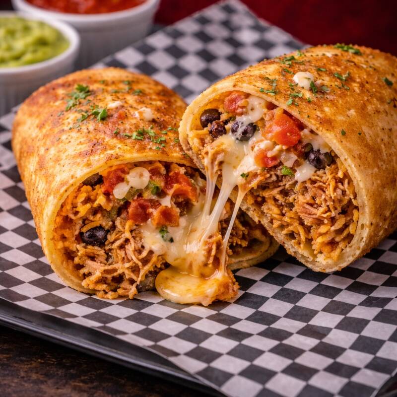 Tortilla frita rellena, dorada y crujiente, cargada de sabor tex-mex perfecta para un antojo contundente