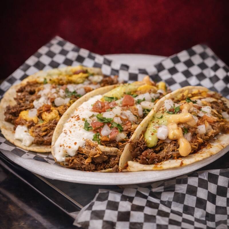 Tacos con la proteína de tu preferencia (Pollo, Carne desmechada o Cerdo). Incluye guacamole y sour cream.
