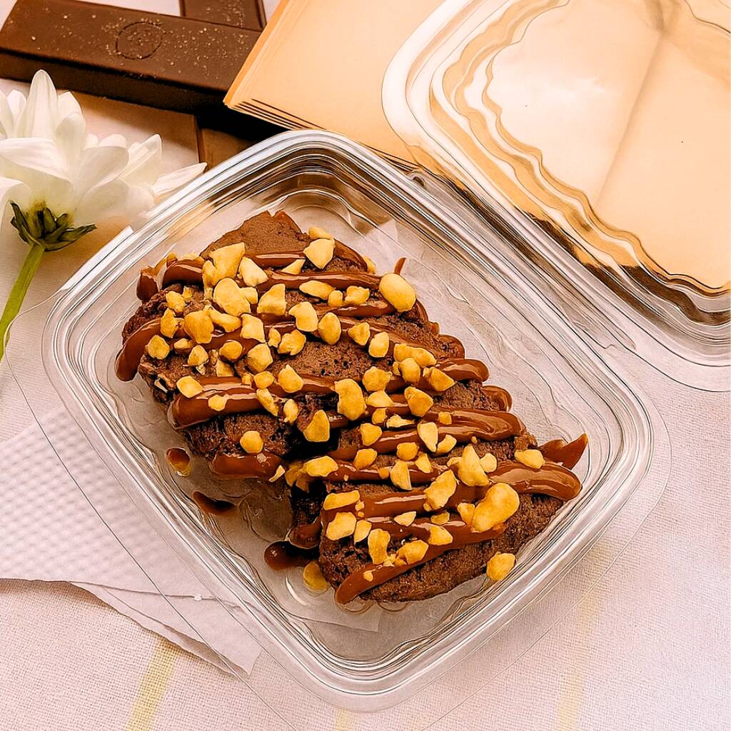 Dos porciones de brownie de la casa con topping de salsa de chocolate y trozos maní.