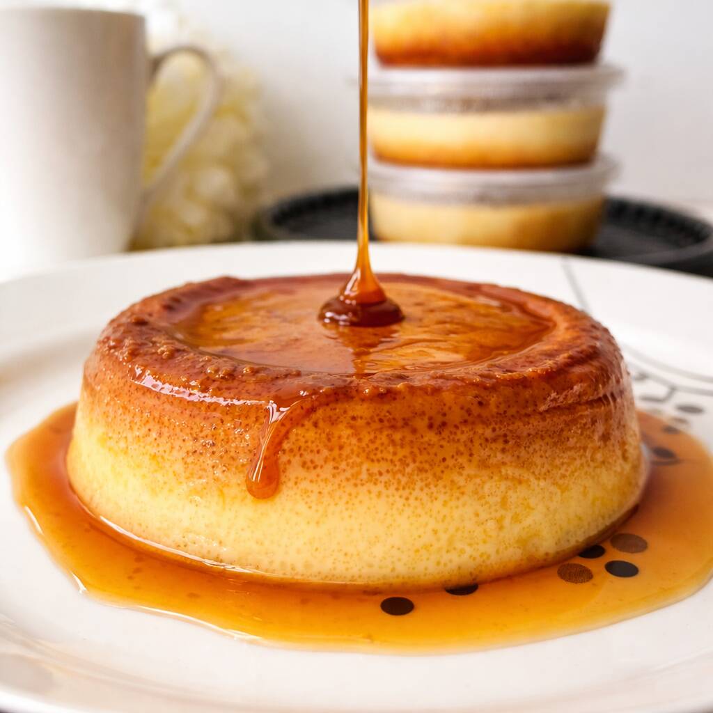 Flan con caramelo. su sabor y textura ofrece una experiencia cremosa con notas de vainilla. porción individual de 8 oz.