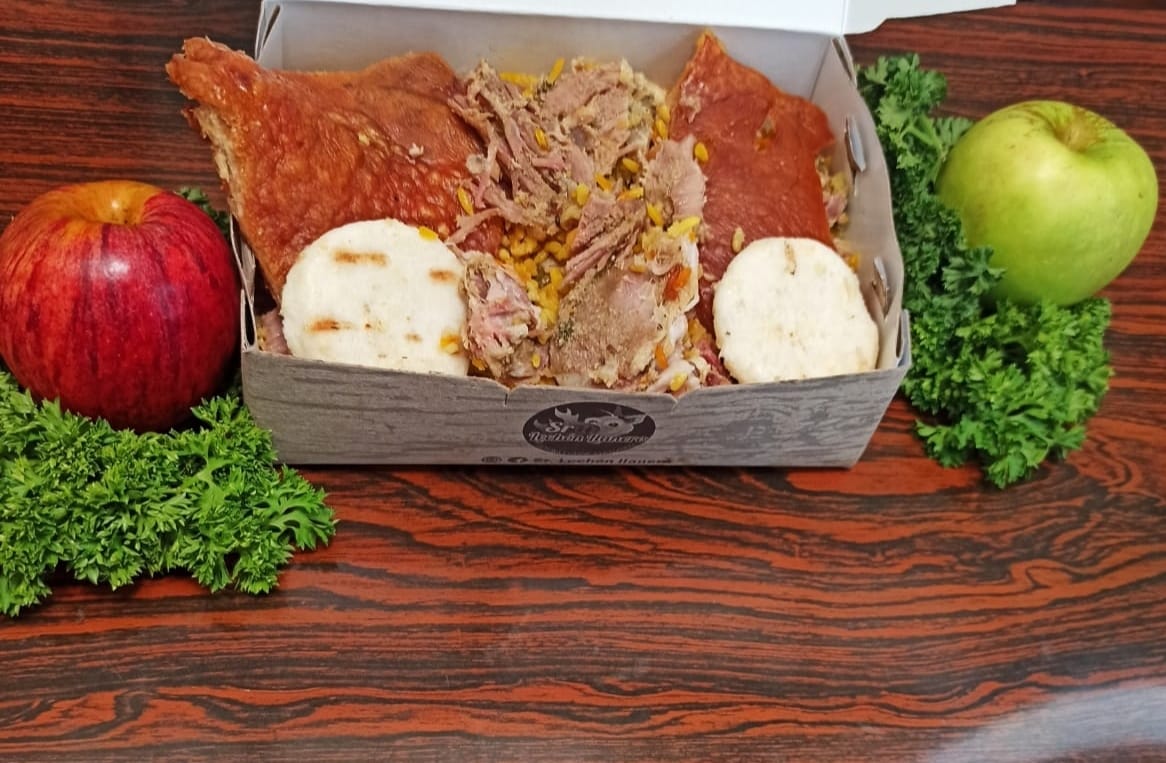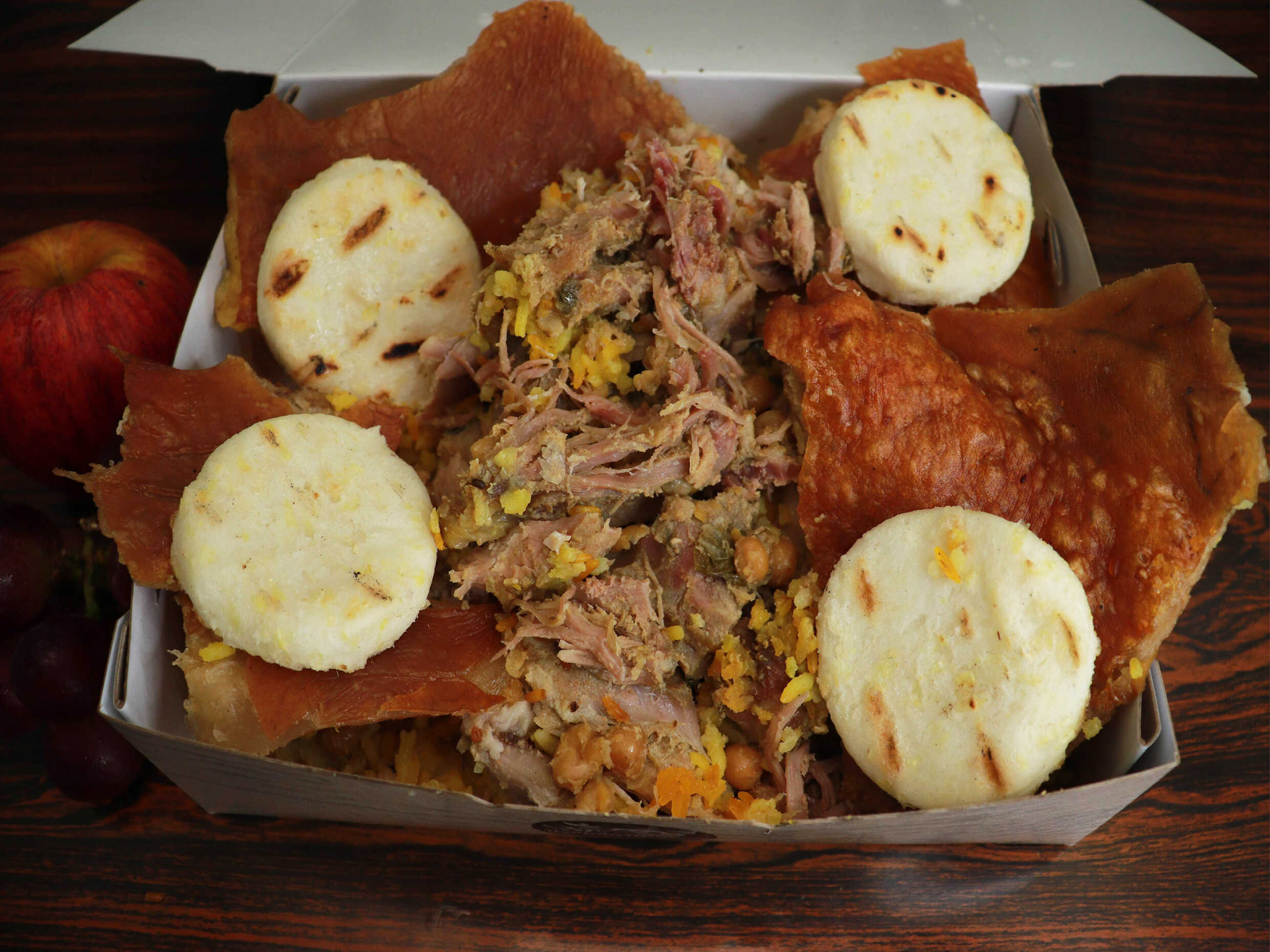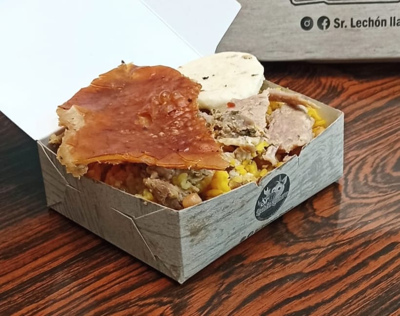 Libra y media de deliciosa lechona (750 gramos) perfecta para compartir con un sabor muy autentico, acompañada de 3 cueros crocantes y 3 arepas