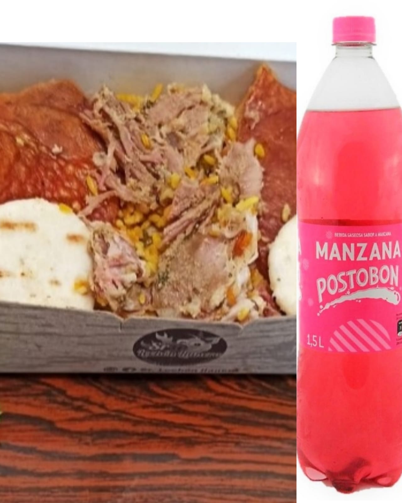 Platillo personal: lleva tu combo con una porción personal de 400 g de lechona, 1 arepa, 1 cuerito y una bebida Postobón de 250 ml (sabor disponible en tienda).