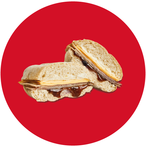 Jamón de cordero sobre pan artesanal, con queso holandés, queso crema y salsa de arándanos.