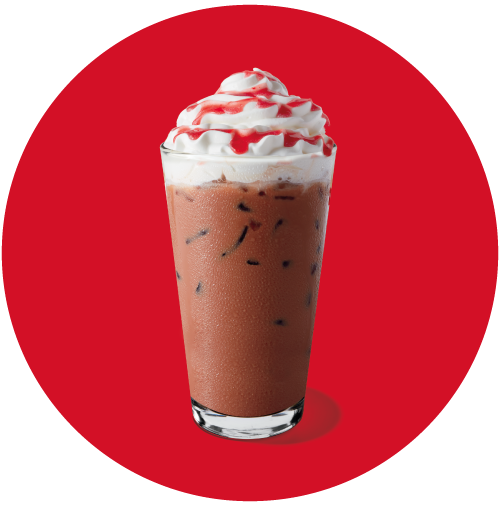 Bebida con cubos de hielo a base de salsa de fresa, chocolate y chocolate blanco con espresso 100% colombiano y leche a tu elección. Terminada con crema batida y espiral de salsa de fresa