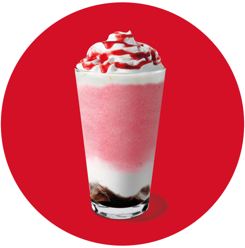 Bebida licuada con salsa de fresa y chocolate blanco mezclado con leche y hielo, vertido sobre capas de salsa de mocha. Terminada con crema batida y espiral de salsa de fresa