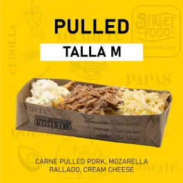 Papas fritas, carne desmechada cerdo, queso crema, queso mozarella rallado.