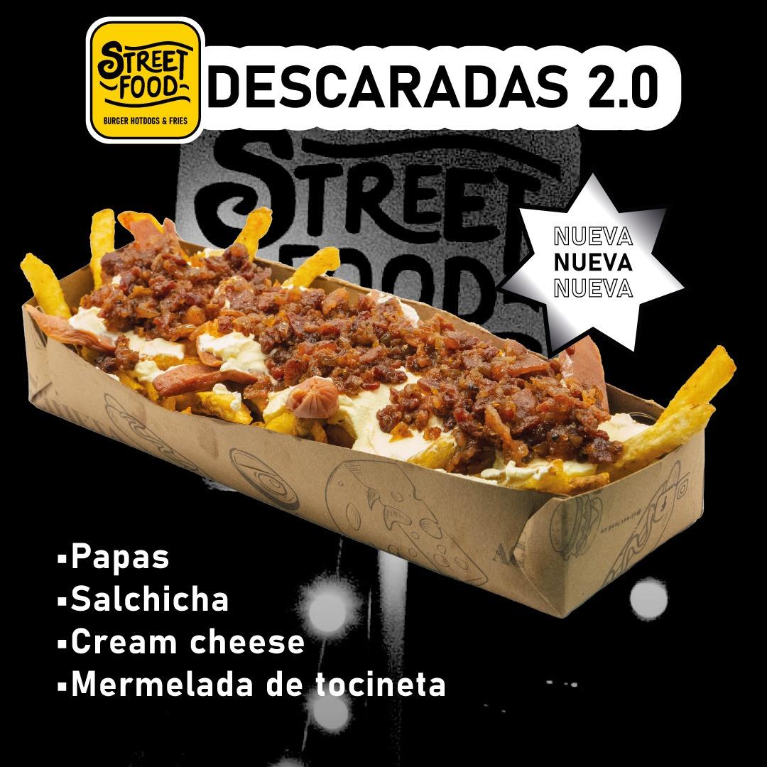 Papas fritas, mermelada de tocineta, salchicha, queso crema.