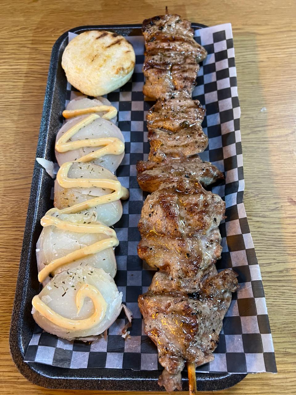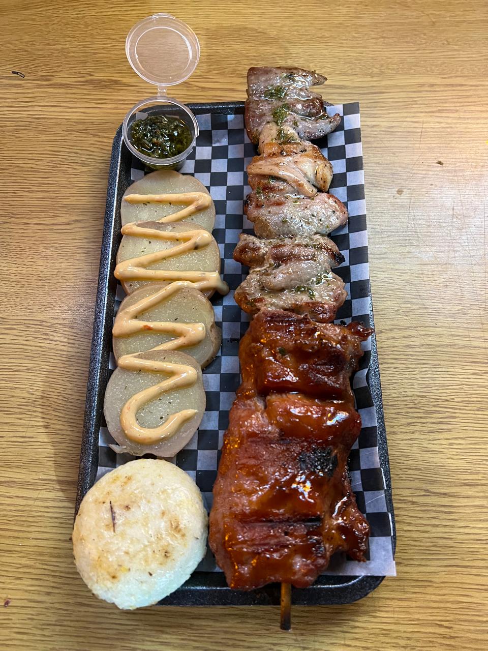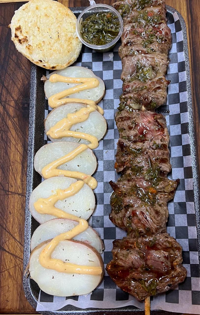 Chuzo con 4 cortes 260 g de res, pollo, costilla y cerdo acompañado con papa al vapor, arepa y chimichurri.