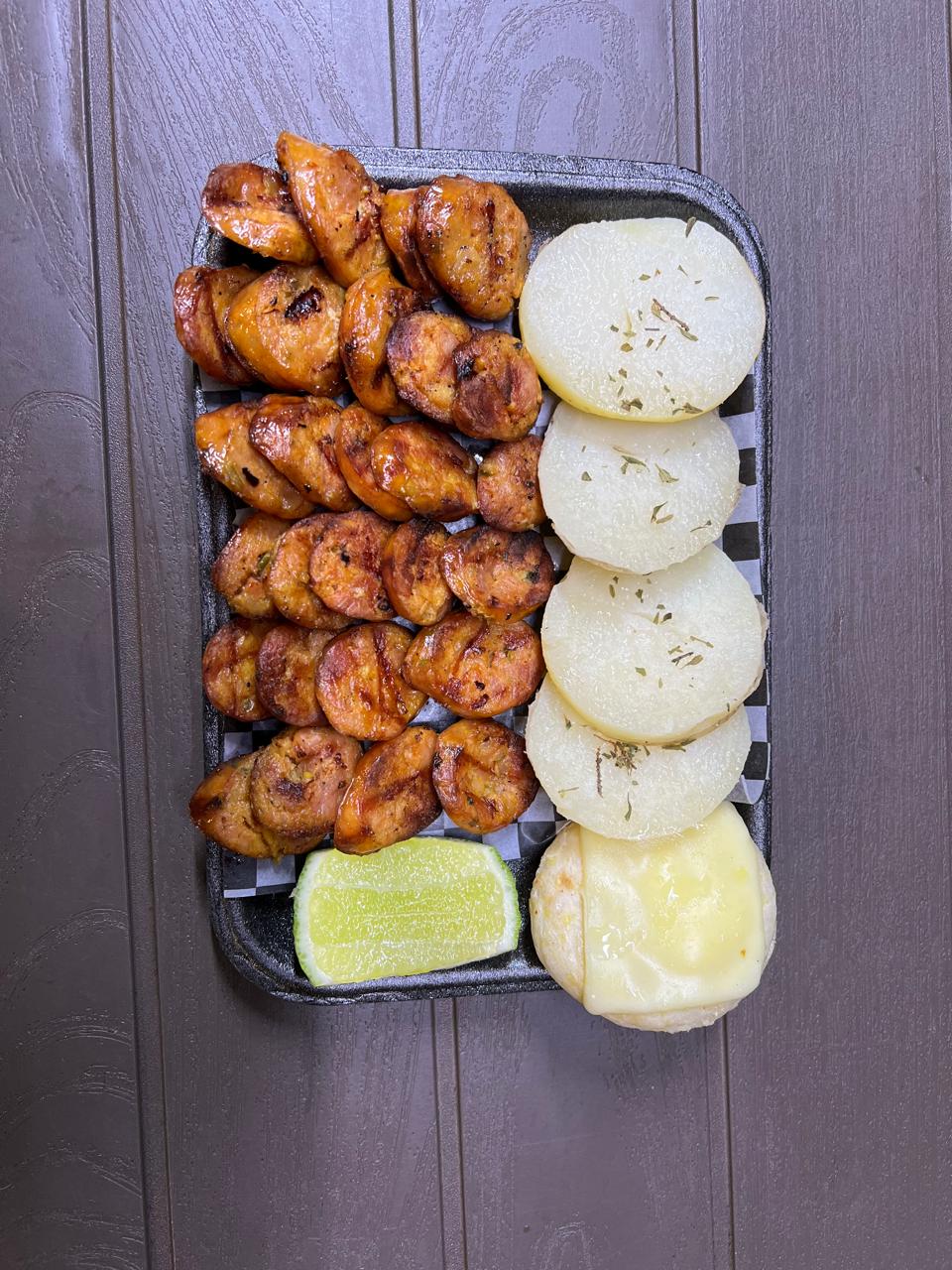Chorizo 150 g antioqueño con papa al vapor y arepa con mozzarella.