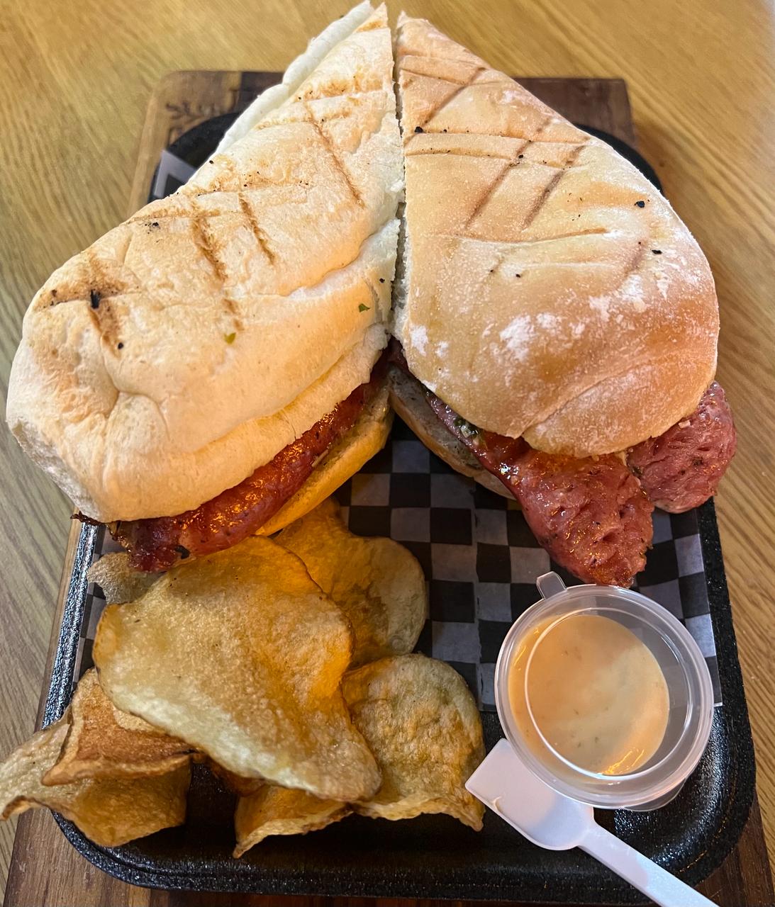 Pan tipo baguette con chorizo de 200 g, chimichurri, pico de gallo, salsa de la casa y queso mozzarella.