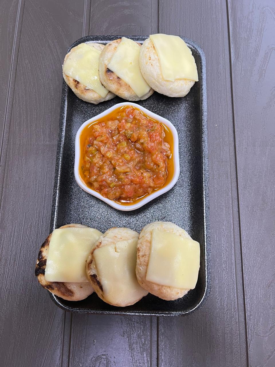 Arepa con hogao, 6 arepas con mozzarella y porción de hogao.