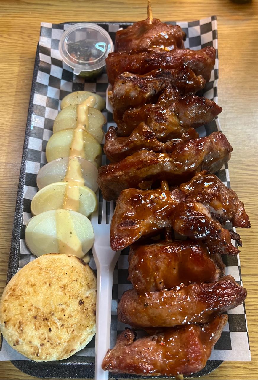 Chuzo de costilla de cartílago 350 g con papa al vapor, BBQ, arepa y salsa de la casa.