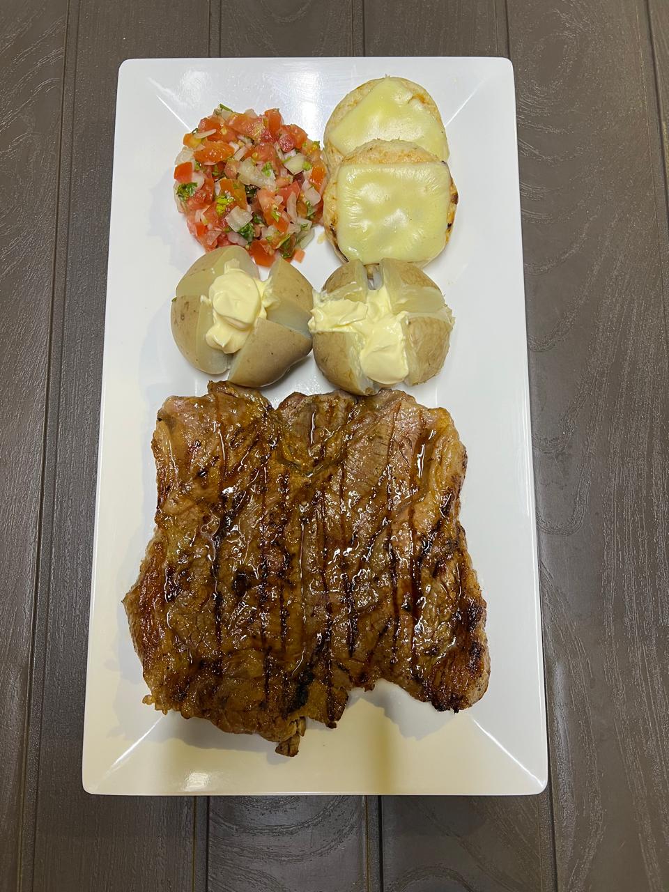 260 g de puro sabor acompañado con papa al vapor con sour cream, arepa con mozzarella, pico de gallo y chimichurri.