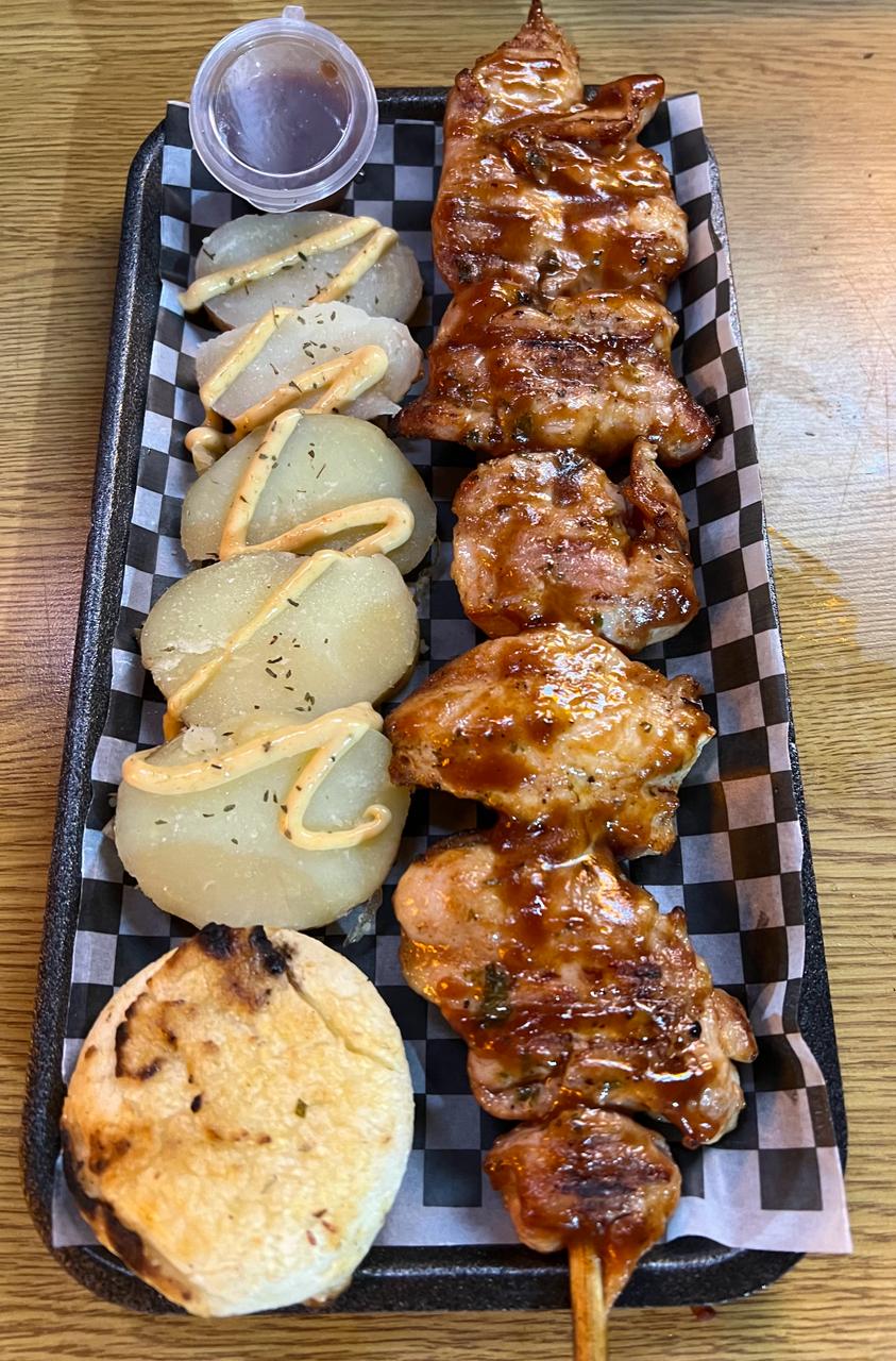 Chuzo de pollo 300 g con salsa BBQ, arepa, papa al vapor y salsa de la casa.