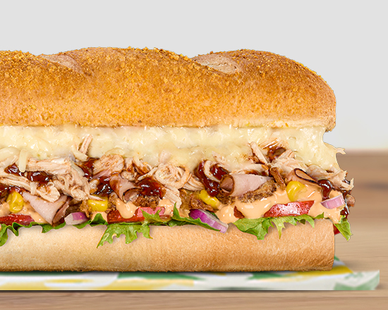 ¡Jugoso y delicioso! Rodajas de queso derretidas sobre carne de costilla de cerdo en salsa BBQ. Complétalo con tu elección de quesos, salsas y vegetales frescos en nuestro pan recién horneado.