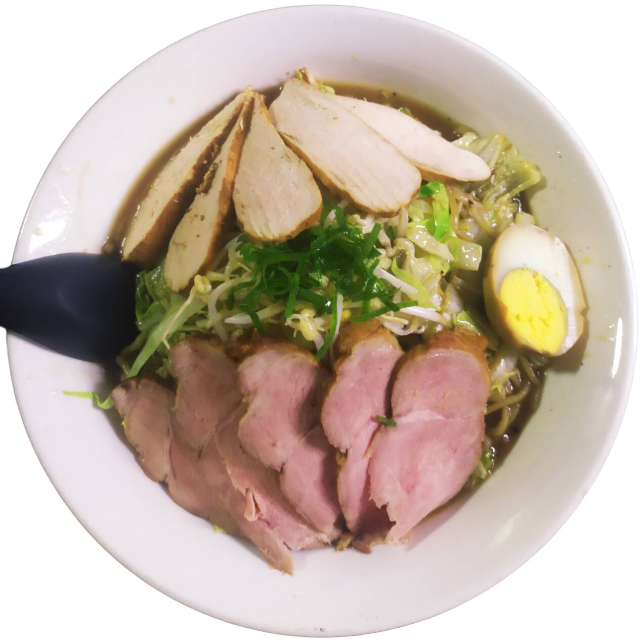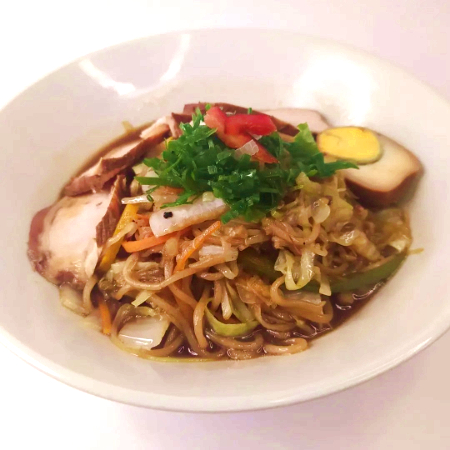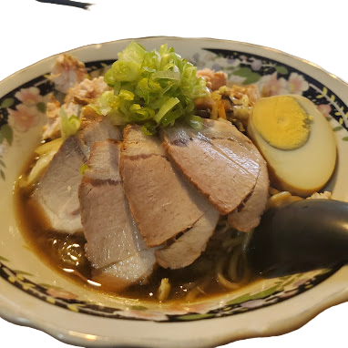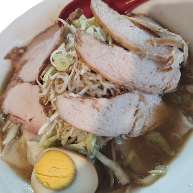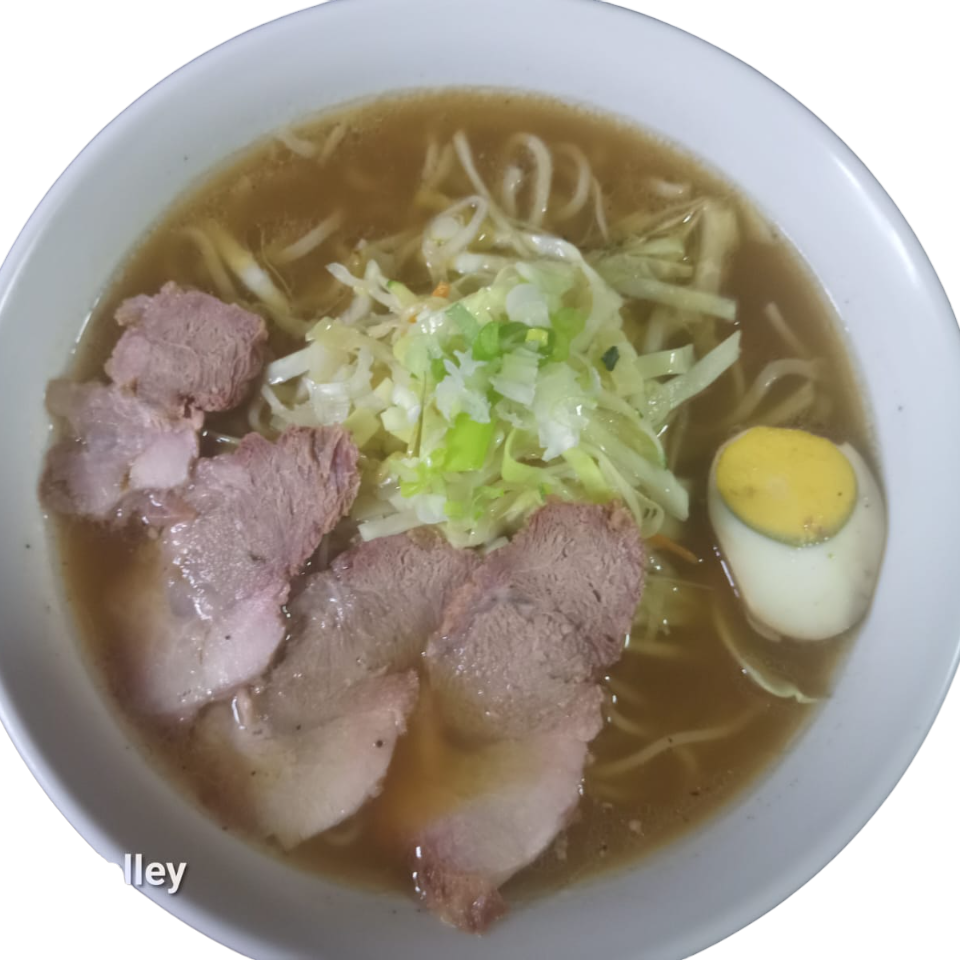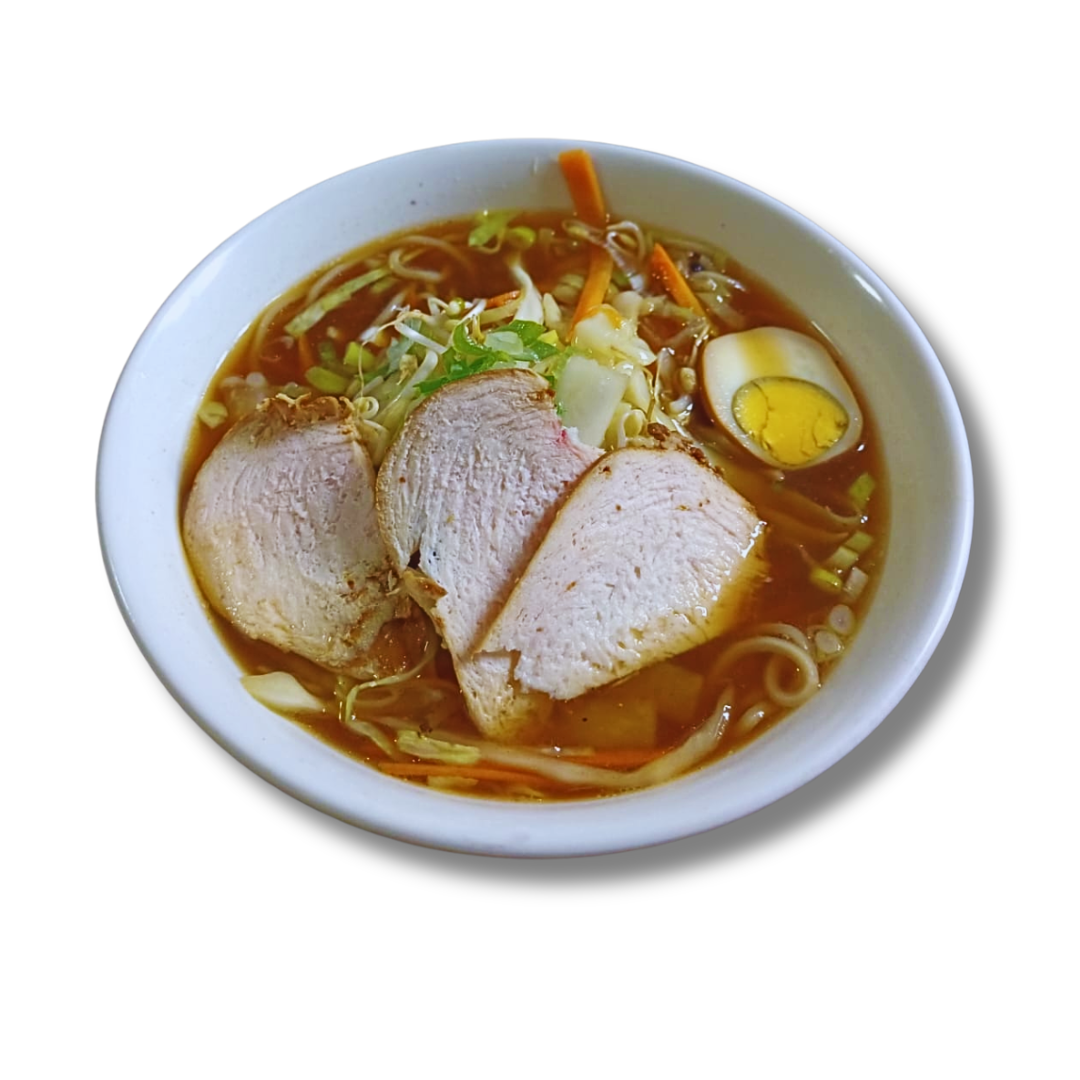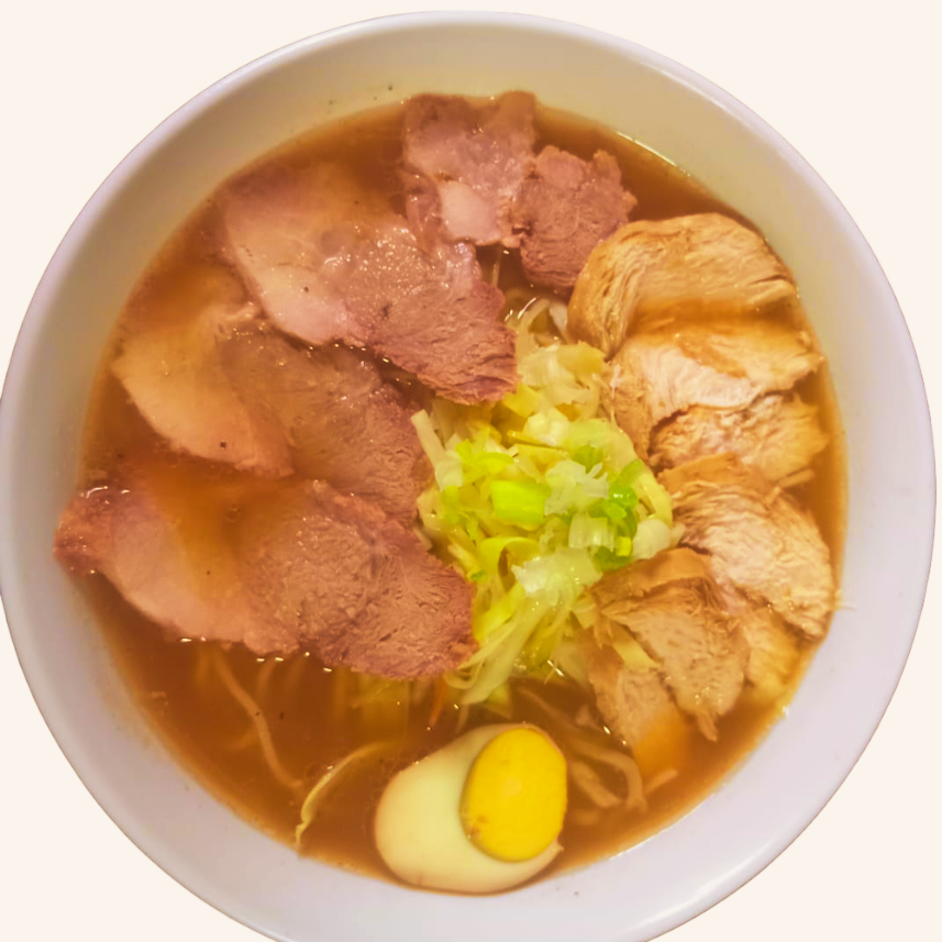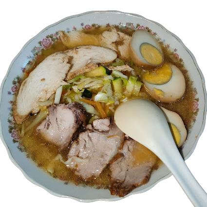 Rico caldo a base de pollo, cerdo y vegetales de temporada, miso, con pastas cocidas, cebollín, huevo, pollo y cerdo.