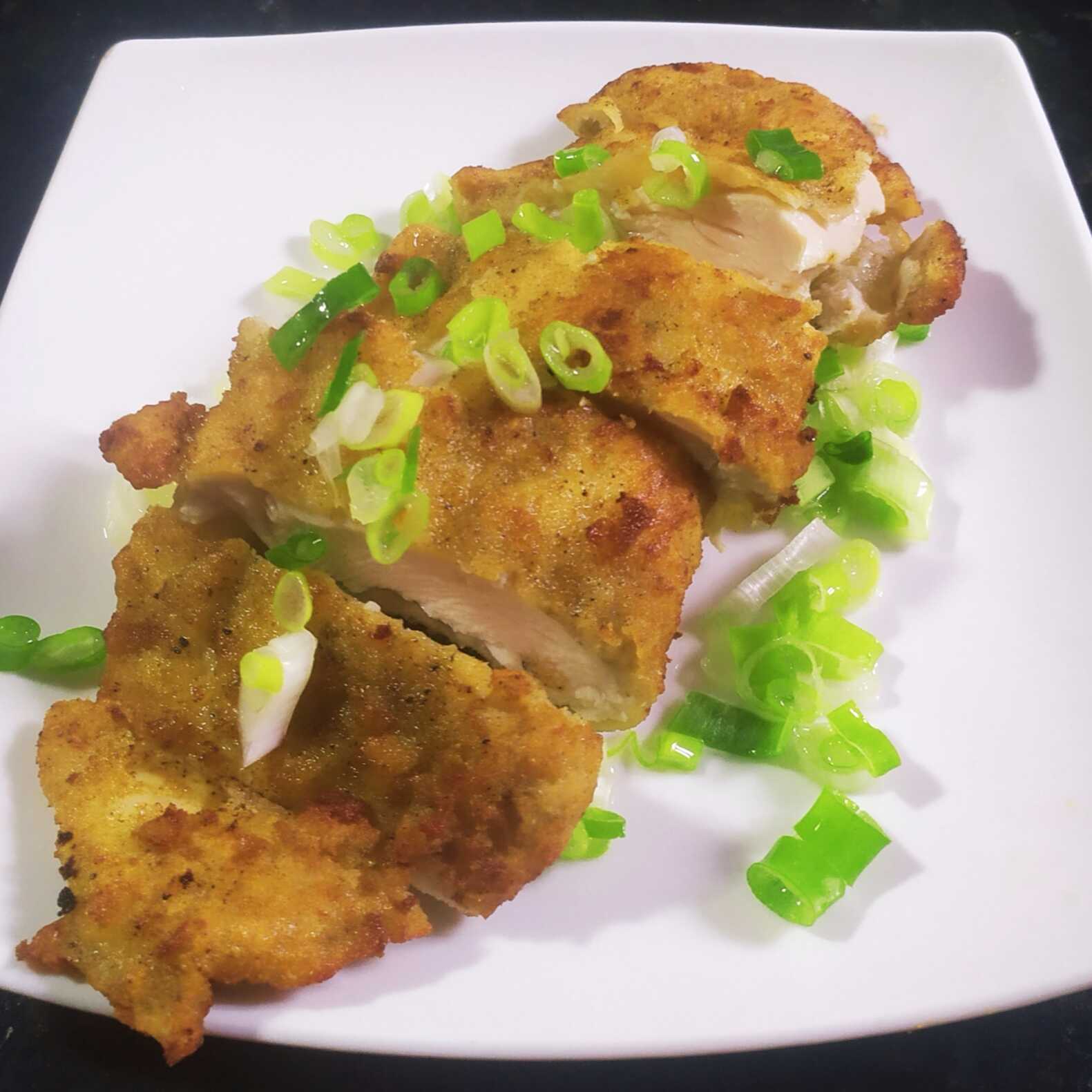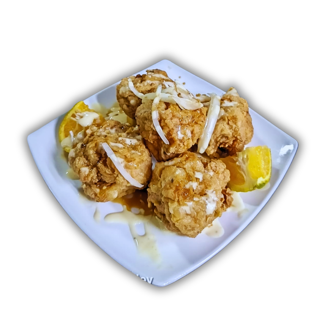 Pollo frito al estilo japonés con ajo, jengibre y soya, salsas de la casa, lechuga y cebolla.