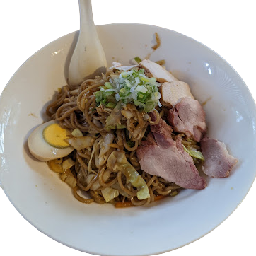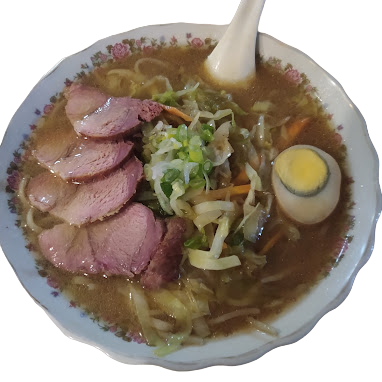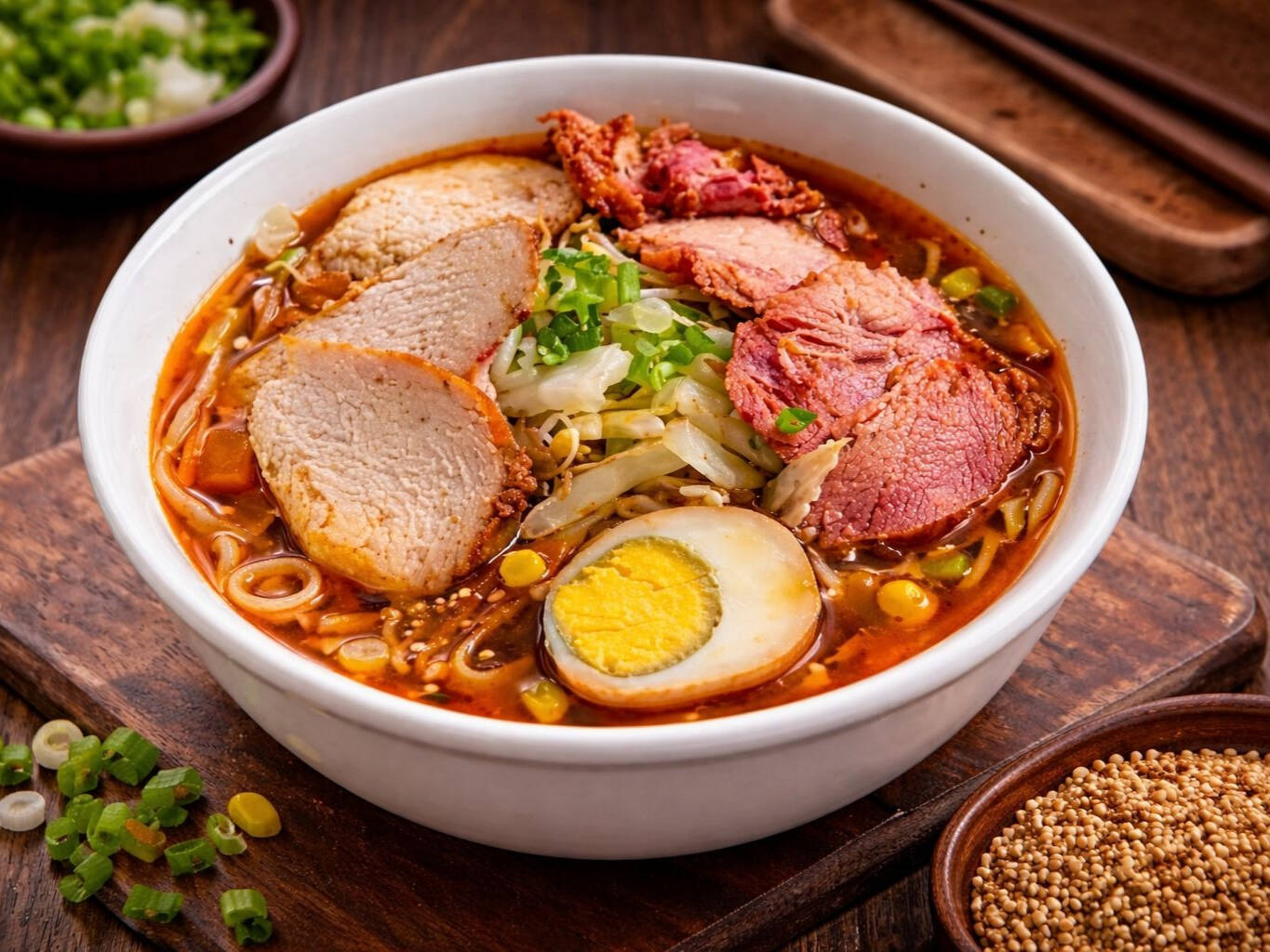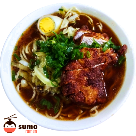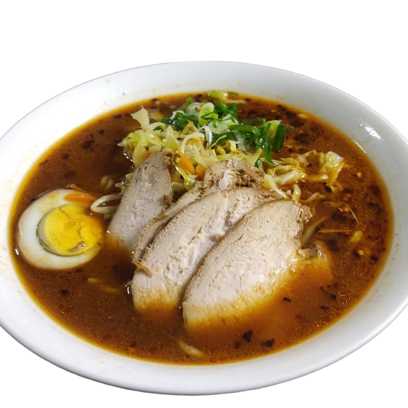 Rico caldo a base de pollo, cerdo y vegetales de temporada, miso picante, con pastas cocidas, cebollín, huevo y cerdo.