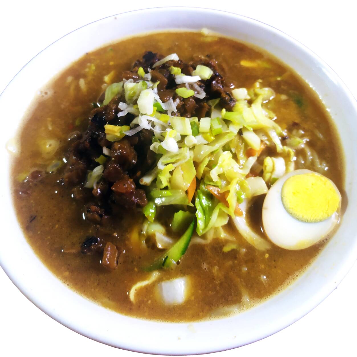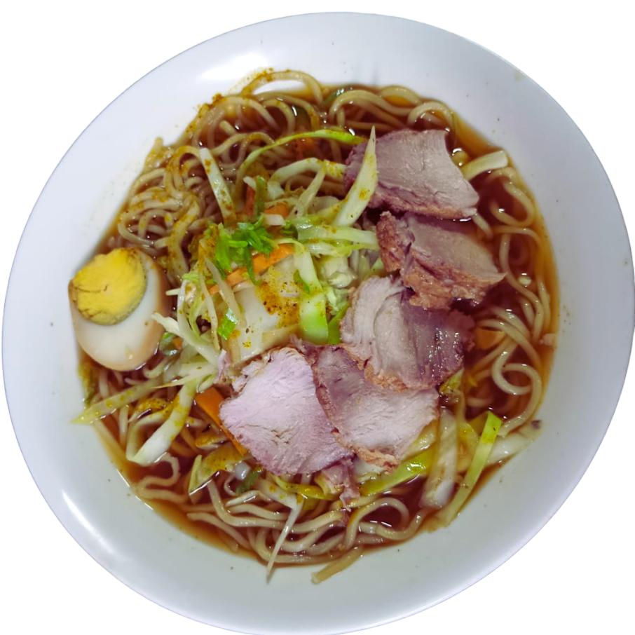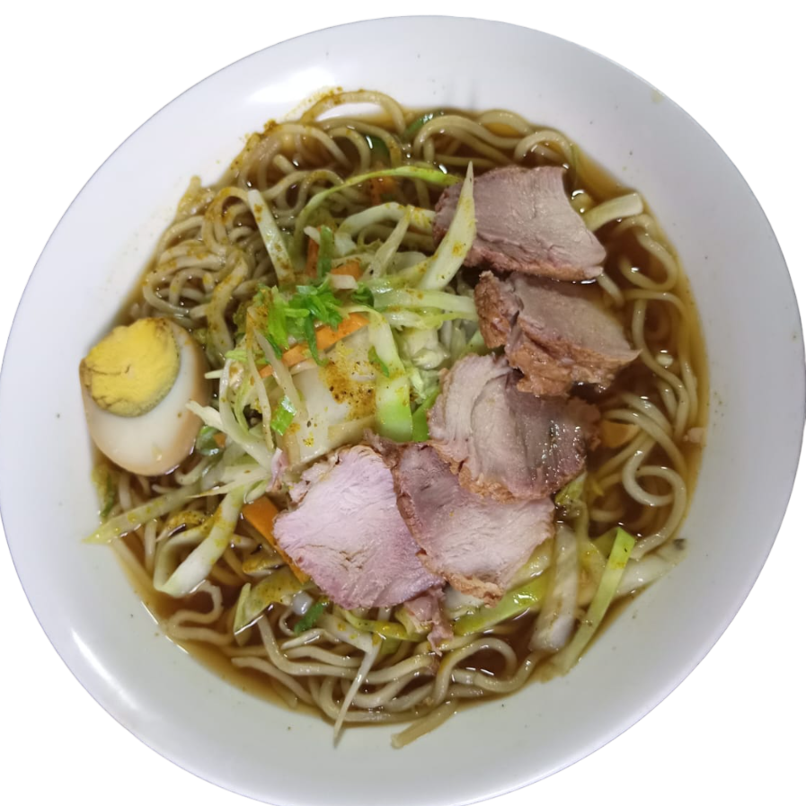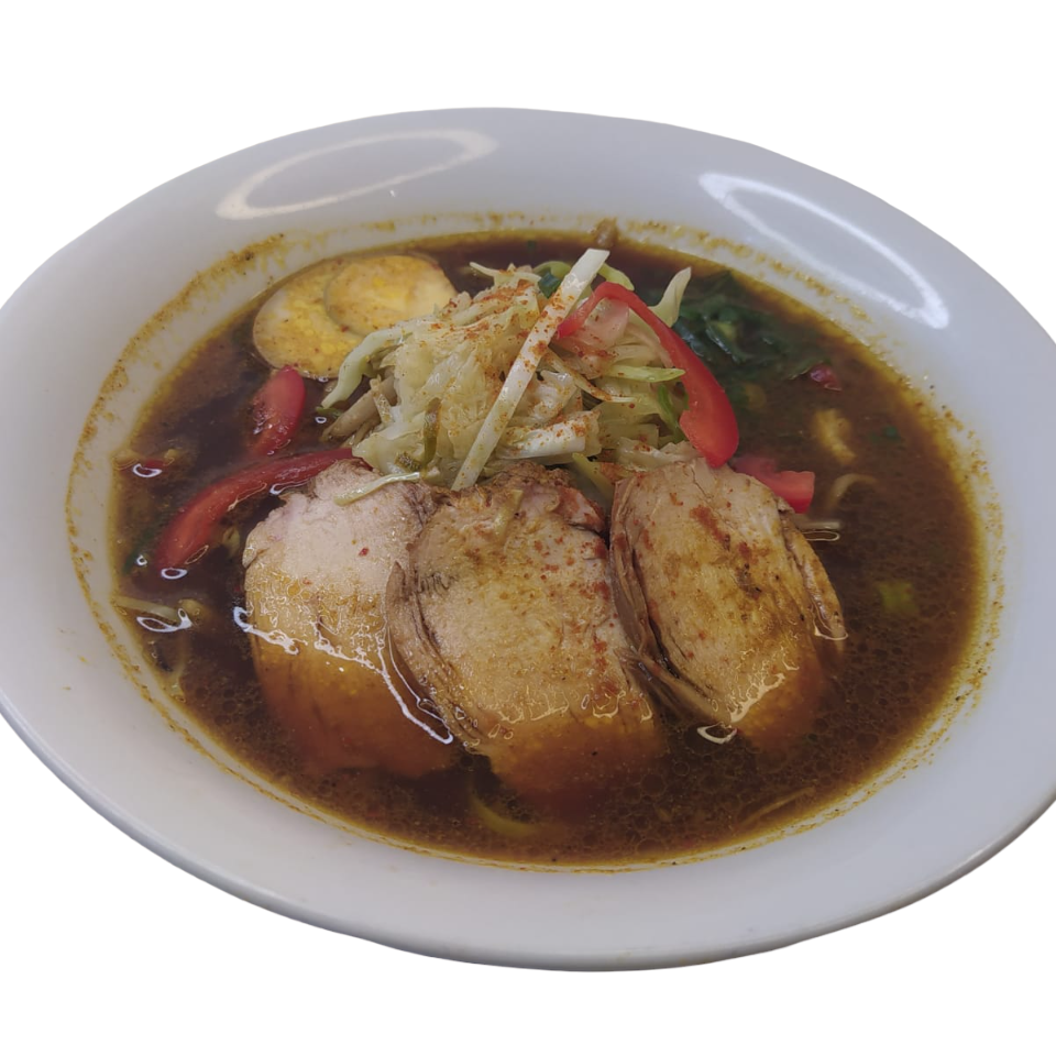 Rico caldo a base de pollo, cerdo y vegetales de temporada, curry picante, con pastas cocidas, cebollín, huevo y cerdo.