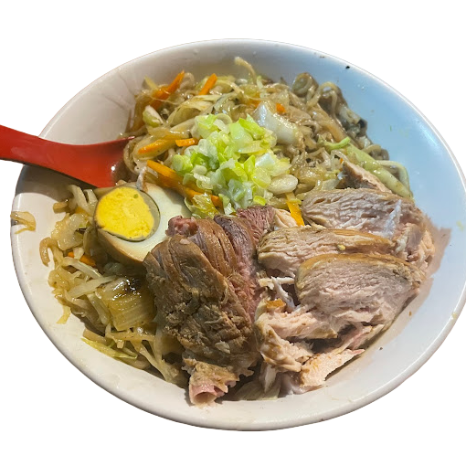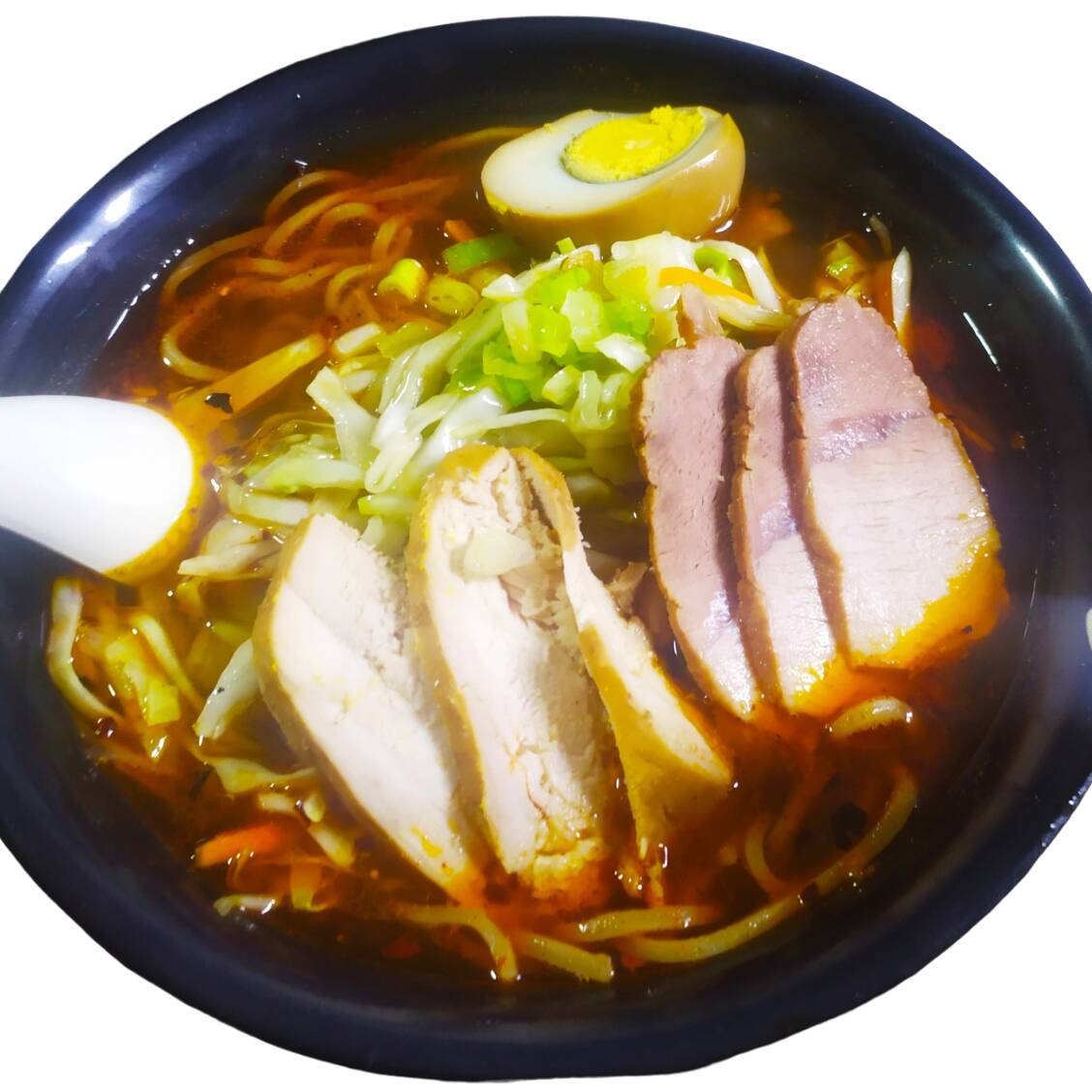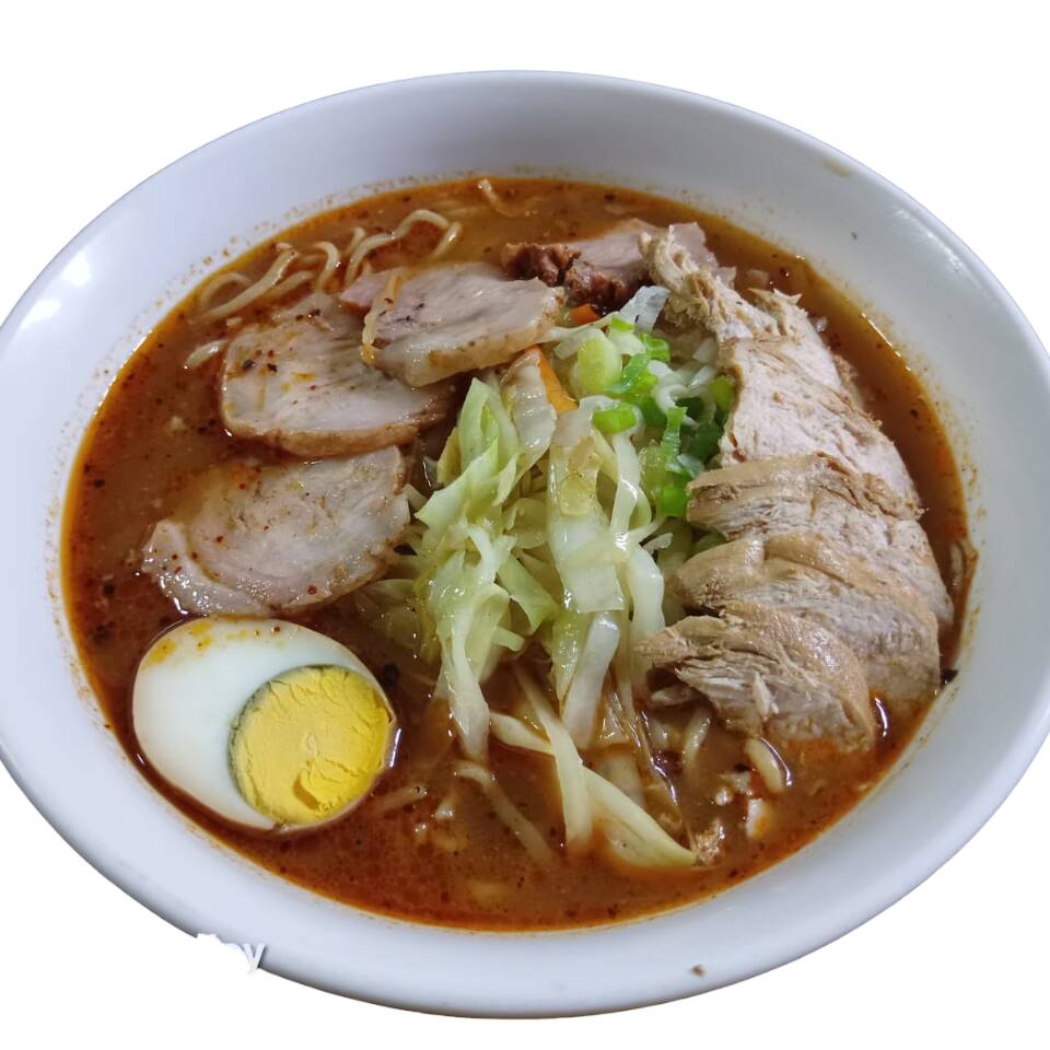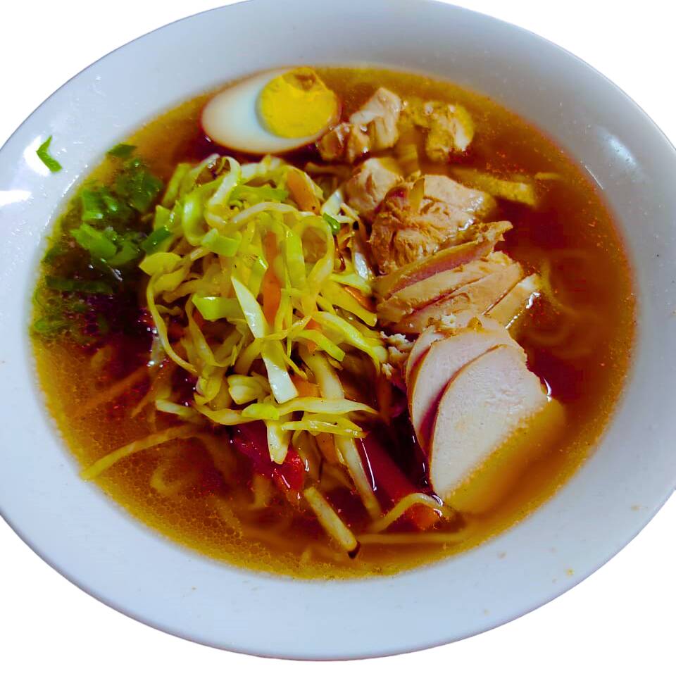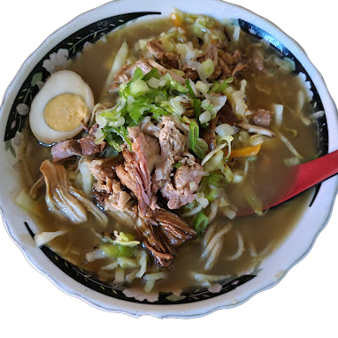 Rico caldo a base de pollo, cerdo y vegetales de temporada, miso picante, con pastas cocidas, cebollín, huevo y pollo.