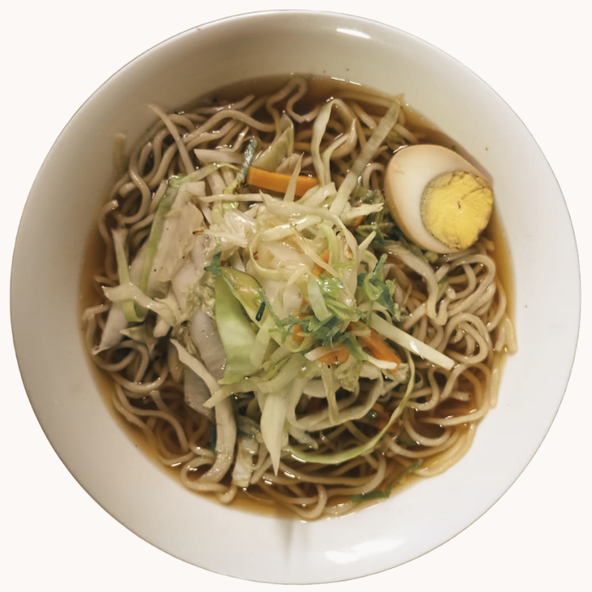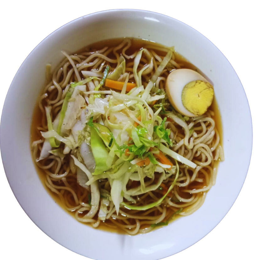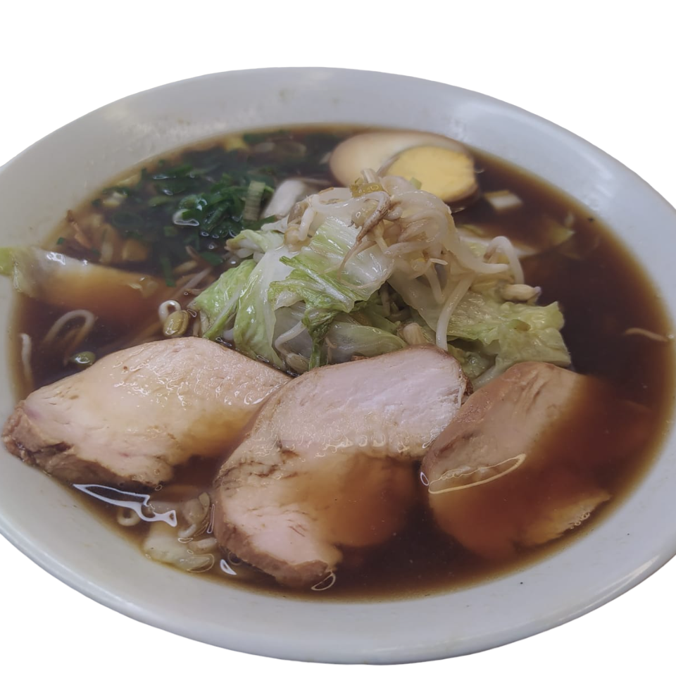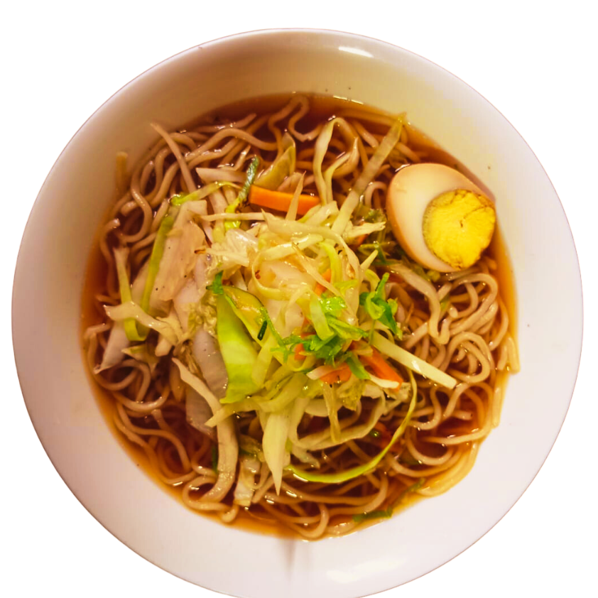 Caldo a base de pollo, cerdo y vegetales de temporada, col china, ajo, jengibre, pastas, cebollín, huevo y pollo.